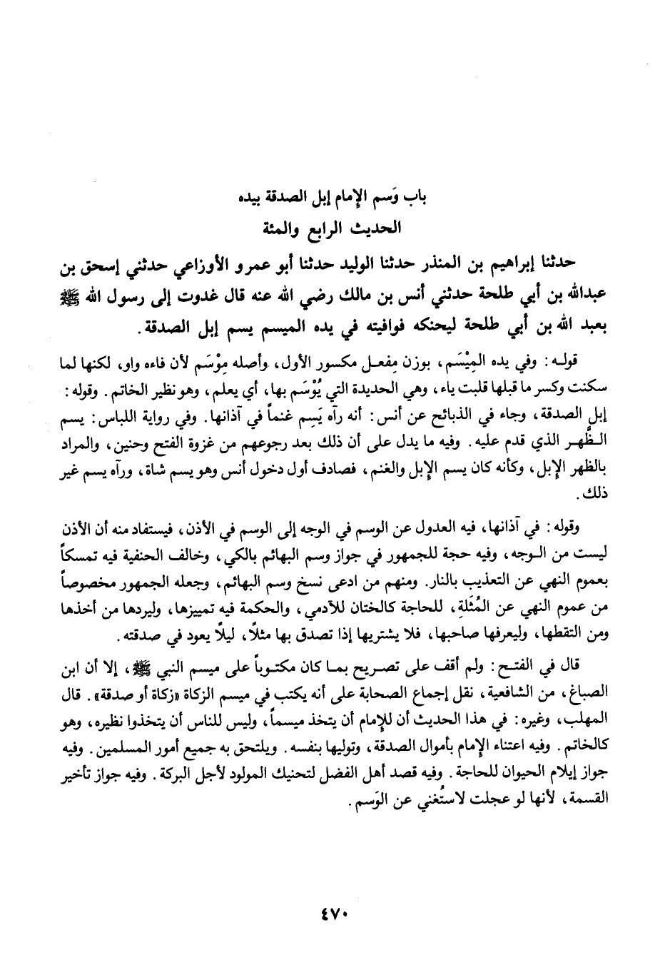 حَدَّثَنَا إِبْرَاهِيمُ بْنُ الْمُنْذِرِ حَدَّثَنَا الْوَلِيدُ حَدَّثَنَا أَبُو عَمْرٍو الأَوْزَاعِيُّ حَدَّثَنِي إِسْحَاقُ بْنُ عَبْدِ اللَّهِ بْنِ أَبِي طَلْحَةَ حَدَّثَنِي أَنَسُ بْنُ مَالِكٍ رضي الله عنه قَالَ غَدَوْتُ إِلَى رَسُولِ اللَّهِ -صلى الله عليه وسلم- بِعَبْدِ اللَّهِ بْنِ أَبِي طَلْحَةَ لِيُحَنِّكَهُ، فَوَافَيْتُهُ فِي يَدِهِ الْمِيسَمُ يَسِمُ إِبِلَ الصَّدَقَةِ.
