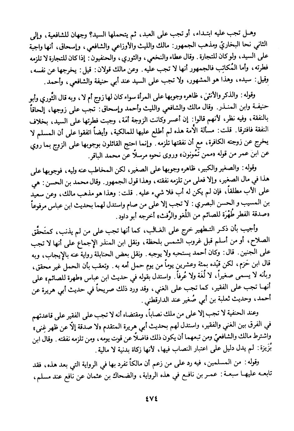 وعند الحنفية لا تجب إلا على من ملك نصابًا، ومقتضاه أنه لا تجب على الفقير على قاعدتهم في الفرق بين الغني والفقير، واستدل لهم بحديث أبي هريرة المتقدم "لا صدقة إلاّ عن ظهر غِنى" واشترط مالك والشافعيّ ومن تبعهما أن يكون ذلك فاضلًا عن قوت يومه، ومن تلزمه نفقته. وقال ابن بُزَيزة: لم يدل دليل على اعتبار النصاب فيها، لأنها زكاة بدنية لا مالية.