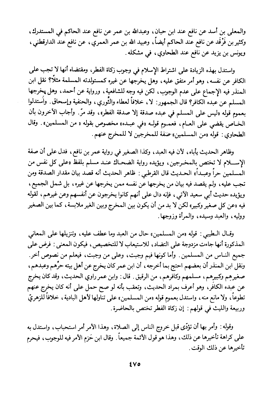 وظاهر الحديث يأباه، لأن فيه العبد، وكذا الصغير في رواية عمر بن نافع، فدل على أن صفة الإِسلام لا تختص بالمخرجين، ويؤيده رواية الضحاك عند مسلم بلفظ "على كل نفس من المسلمين حرًا وعبدًا" الحديث قال القرطبي: ظاهر الحديث أنه قصد بيان مقدار الصدقة ومن تجب عليه، ولم يقصد فيه بيان من يخرجها عن نفسه ممن يخرجها عن غيره، بل شمل الجميع، ويؤيده حديث أبي سعيد الآتي، فإنه دال على أنهم كانوا يخرجون عن أنفسهم وعن غيرهم، لقوله فيه "عن كل صغير وكبير" لكن لابد من أن يكون بين المخرج وبين الغير ملابسة، كما بين الصغير ووليه، والعبد وسيده، والمرأة وزوجها.