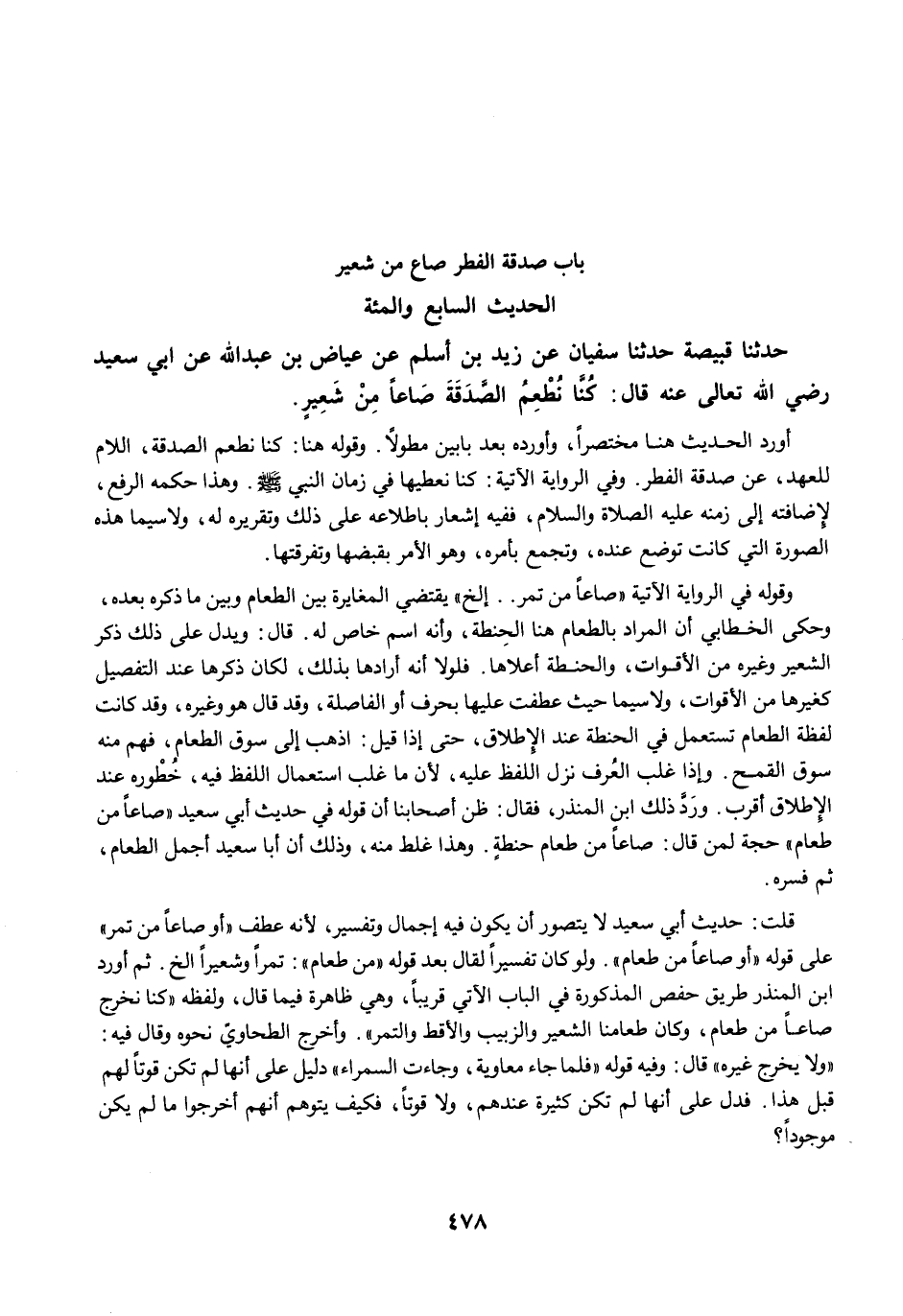 قلت: حديث أبي سعيد لا يتصور أن يكون فيه إجمال وتفسير؛ لأنه عطف "أو صاعًا من تمر" على قوله "أو صاعًا من طعام". ولو كان تفسيرًا لقال بعد قوله "من طعام": تمرًا وشعيرًا الخ. ثم أورد ابن المنذر طريق حفص المذكورة في الباب الآتي قريبًا، وهي ظاهرة فيما قال، ولفظه "كنا نخرج صاعًا من طعام، وكان طعامنا الشعير والزبيب والأقط والتمر". وأخرج الطحاويّ نحوه وقال فيه: "ولا يخرج غيره" قال: وفيه قوله "فلما جاء معاوية، وجاءت السمراء" دليل على أنها لم تكن قوتًا لهم قبل هذا. فدل على أنها لم تكن كثيرة عندهم، ولا قوتًا، فكيف يتوهم أنهم أخرجوا ما لم يكن موجودًا؟