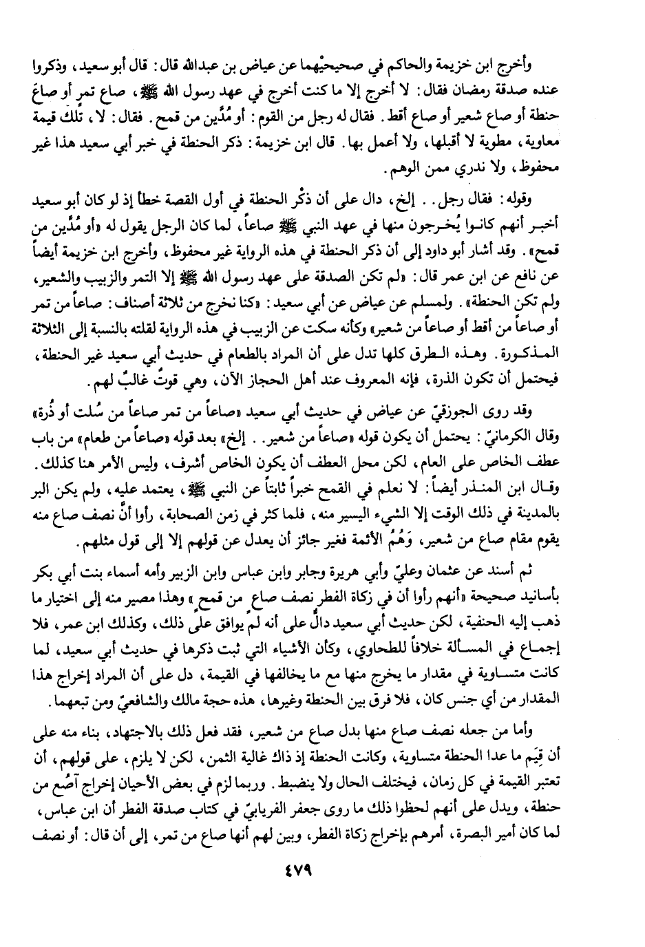 وأخرج ابن خزيمة والحاكم في صحيحيْهما عن عياض بن عبد الله قال: قال أبو سعيد، وذكروا عنده صدقة رمضان فقال: لا أخرج إلا ما كنت أخرج في عهد رسول الله -صلى الله عليه وسلم-، صاع تمرٍ أو صاع حنطة أو صاع شعير أو صاع أقط. فقال له رجل من القوم: أو مُدَّين من قمح. فقال: لا، تلك قيمة معاوية، مطوية لا أقبلها، ولا أعمل بها. قال ابن خزيمة: ذكر الحنطة في خبر أبي سعيد هذا غير محفوظ، ولا ندري ممن الوهم.