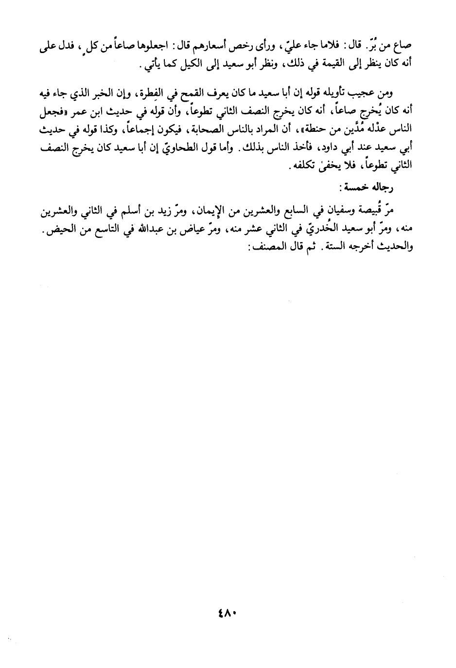 ومن عجيب تأويله قوله إن أبا سعيد ما كان يعرف القمح في الفِطرة، وإن الخبر الذي جاء فيه أنه كان يُخرج صاعًا، أنه كان يخرج النصف الثاني تطوعًا، وأن قوله في حديث ابن عمر "فجعل الناس عدْله مُدَّين من حنطة"، أن المراد بالناس الصحابة، فيكون إجماعًا، وكذا قوله في حديث أبي سعيد عند أبي داود، فأخذ الناس بذلك. وأما قول الطحاويّ إن أبا سعيد كان يخرج النصف الثاني تطوعًا، فلا يخفى تكلفه.