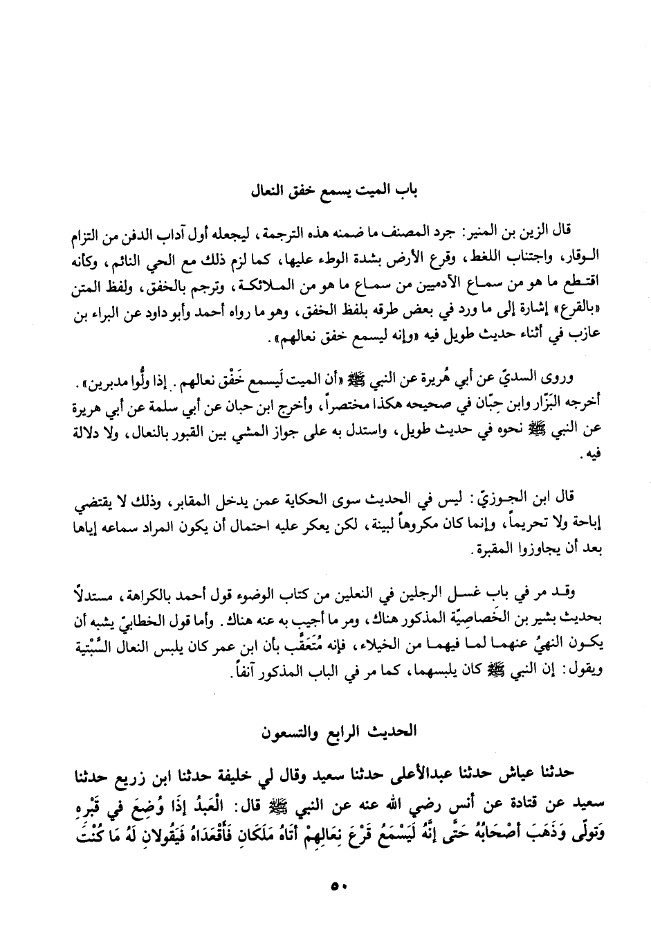 وروى السديّ عن أبي هُريرة عن النبي -صلى الله عليه وسلم- "أن الميت لَيسمع خَفْق نعالهم. إذا ولُّوا مدبرين". أخرجه البَزّار وابن حِبّان في صحيحه هكذا مختصرًا، وأخرج ابن حبان عن أبي سلمة عن أبي هريرة عن النبي -صلى الله عليه وسلم- نحوه في حديث طويل، واستدل به على جواز المشي بين القبور بالنعال، ولا دلالة فيه.