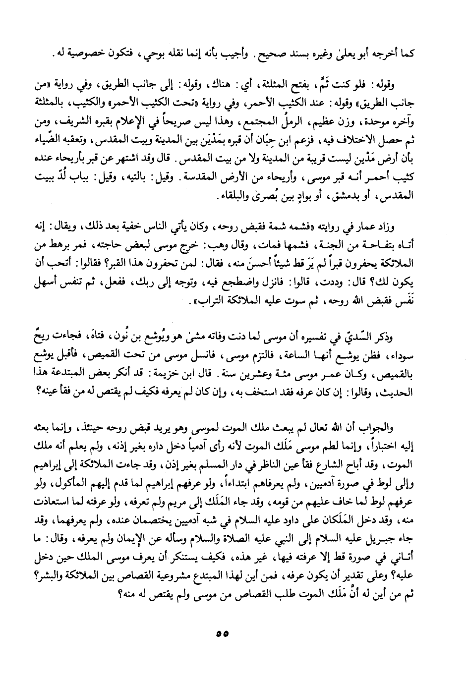 والجواب أن الله تعالى لم يبعث ملك الموت لموسى وهو يريد قبض روحه حينئذ، وإنما بعثه إليه اختبارًا، وإنما لطم موسى مَلَك الموت لأنه رأى آدميًا دخل داره بغير إذنه، ولم يعلم أنه ملك الموت، وقد أباح الشارع فقأ عين الناظر في دار المسلم بغير إذن، وقد جاءت الملائكة إلى إبراهيم وإلى لوط في صورة آدميين، ولم يعرفاهم ابتداءًا، ولو عرفهم إبراهيم لما قدم إليهم المأكول، ولو عرفهم لوط لما خاف عليهم من قومه، وقد جاء المَلَك إلى مريم ولم تعرفه، ولو عرفته لما استعاذت منه، وقد دخل المَلَكان على داود عليه السلام في شبه آدميين يختصمان عنده، ولم يعرفهما، وقد جاء جبريل عليه السلام إلى النبي عليه الصلاة والسلام وسأله عن الإِيمان ولم يعرفه، وقال: ما أتاني في صورة قط إلا عرفته فيها، غير هذه، فكيف يستنكر أن يعرف موسى الملك حين دخل عليه؟ وعلى تقدير أن يكون عرفه، فمن أين لهذا المبتدع مشروعية القصاص بين الملائكة والبشر؟ ثم من أين له أنَّ مَلَك الموت طلب القصاص من موسى ولم يقتص له منه؟