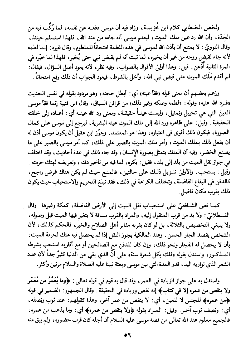 وزعم بعضهم أن معنى قوله "فقأ عينه" أي: أبطل حجته، وهو مردود بقوله في نفس الحديث "فرد الله عنيه" وقوله: "لطمه وصكه وغير ذلك" من قرائن السياق، وقال ابن قتيبة إنما فقأ موسى العينَ التي هي تخييل وتمثيل، وليست عينًا حقيقة، ومعنى رد الله عينه أي: أعاده إلى خلقته الحقيقية. وقيل: على ظاهره ورد الله إلى ملك الموت عينه البشرية، ليرجع إلى موسى على كمال الصورة، فيكون ذلك أقوى في اعتباره، وهذا هو المعتمد. وجوّز ابن عقيل أن يكون موسى أذن له أن يفعل ذلك بملك الموت، وأمر ملك الموت بالصبر على ذلك، كما أمر موسى بالصبر على ما يصنع الخضر، وفيه أن الملك يتمثل بصورة الإنسان، وقد جاء ذلك في عدة أحاديث، وقد اختلف في جواز نقل الميت من بلد إلى بلد، فقيل: يكره، لما فيه من تأخير دفنه، وتعريضه لهتك حرمته. وقيل: يستحب. والأولى تنزيل ذلك على حالتين، فالمنع حيث لم يكن هناك غرض راجح، كالدفن في البقاع الفاضلة، وتختلف الكراهة في ذلك، فقد تبلغ التحريم والاستحباب حيث يكون ذلك بقرب مكان فاضل.