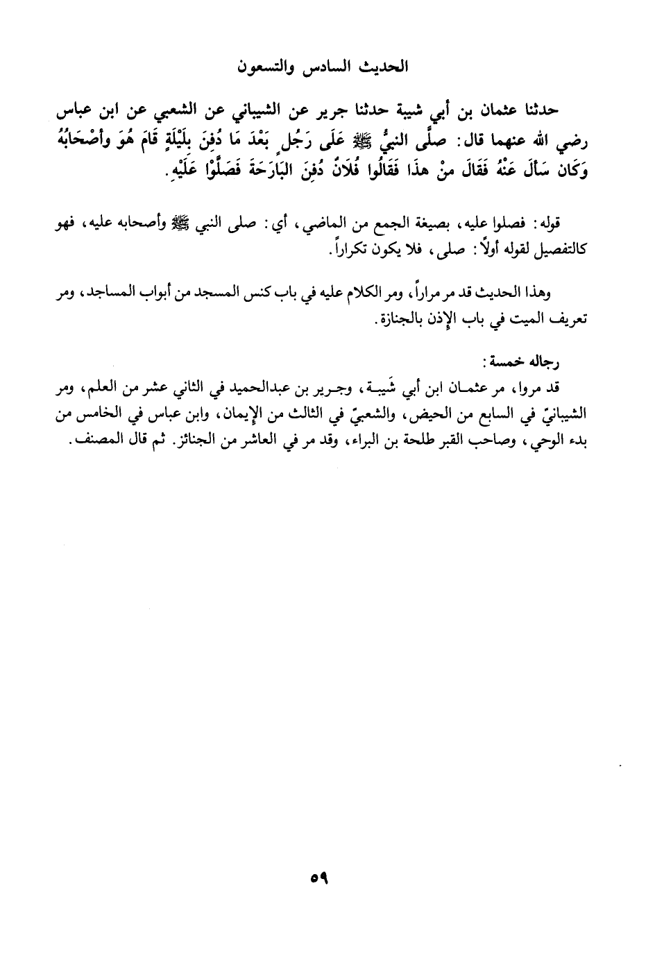 قد مرّوا، مرَّ عثمان ابن أبي شَيبة، وجرير بن عبد الحميد في الثاني عشر من العلم، ومرَّ الشيبانيّ في السابع من الحيض، والشعبيّ في الثالث من الإِيمان، وابن عباس في الخامس من بدء الوحي، وصاحب القبر طلحة بن البراء، وقد مرَّ في العاشر من الجنائز. ثم قال المصنف: