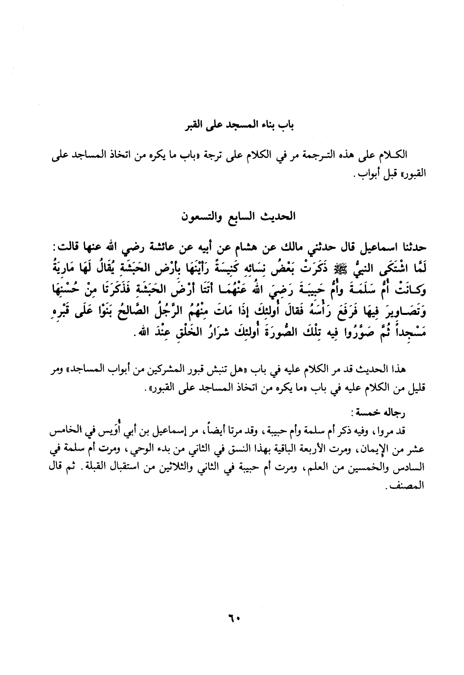 حَدَّثَنَا إِسْمَاعِيلُ قَالَ حَدَّثَنِي مَالِكٌ عَنْ هِشَامٍ عَنْ أَبِيهِ عَنْ عَائِشَةَ رضي الله عنها قَالَتْ: لَمَّا اشْتَكَى النَّبِيُّ -صلى الله عليه وسلم- ذَكَرَتْ بَعْضُ نِسَائِهِ كَنِيسَةً رَأَيْنَهَا بِأَرْضِ الْحَبَشَةِ، يُقَالُ لَهَا مَارِيَةُ، وَكَانَتْ أُمُّ سَلَمَةَ وَأُمُّ حَبِيبَةَ رضي الله عنهما أَتَتَا أَرْضَ الْحَبَشَةِ، فَذَكَرَتَا مِنْ حُسْنِهَا وَتَصَاوِيرَ فِيهَا، فَرَفَعَ رَأْسَهُ فَقَالَ أُولَئِكَ إِذَا مَاتَ مِنْهُمُ الرَّجُلُ الصَّالِحُ بَنَوْا عَلَى قَبْرِهِ مَسْجِدًا، ثُمَّ صَوَّرُوا فِيهِ تِلْكَ الصُّورَةَ، أُولَئِكَ شِرَارُ الْخَلْقِ عِنْدَ اللَّهِ.