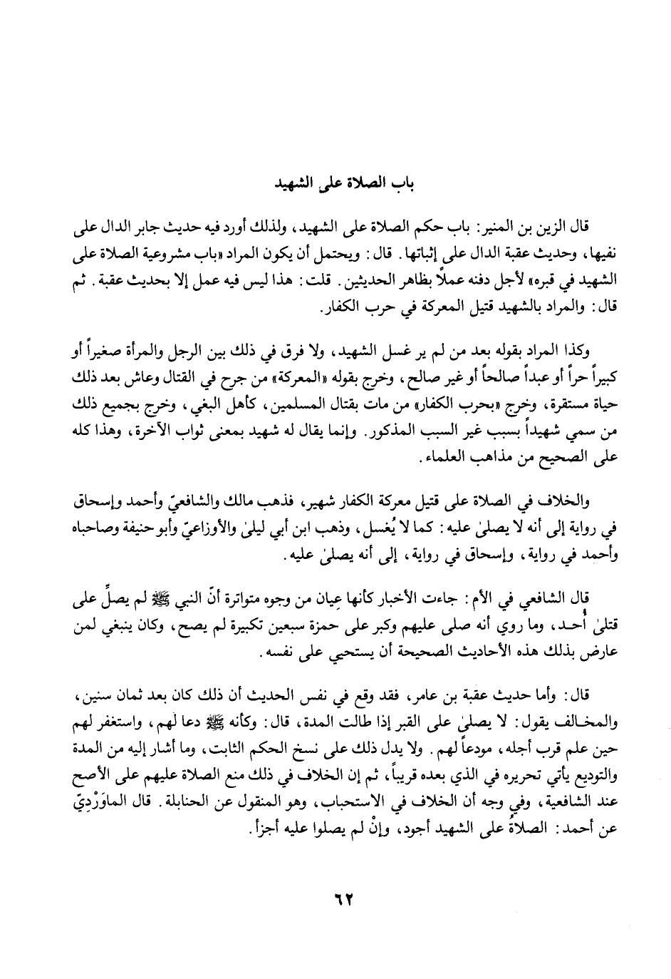 قال الزين بن المنير: باب حكم الصلاة على الشهيد، ولذلك أورد فيه حديث جابر الدال على نفيها، وحديث عقبة الدال على إثباتها. قال: ويحتمل أن يكون المراد "باب مشروعية الصلاة على الشهيد في قبره" لأجل دفنه عملًا بظاهر الحديثين. قلت: هذا ليس فيه عمل إلا بحديث عقبة. ثم قال: والمراد بالشهيد قتيل المعركة في حرب الكفار.