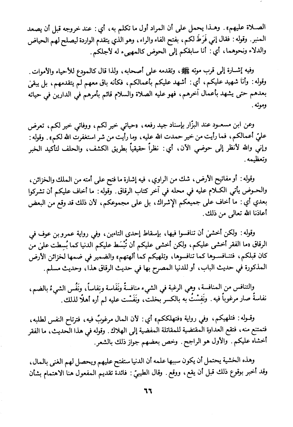 وقوله: أو مفاتيح الأرض، شك من الراوي، فيه إشارة ما فتح على أمته من الملك والخزائن، والحوض يأتي الكلام عليه في محله في آخر كتاب الرقاق. وقوله: ما أخاف عليكم أن تشركوا بعدي أي: ما أخاف على جميعكم الإشراك، بل على مجموعكم, لأن ذلك قد وقع من البعض أعاذنا الله تعالى من ذلك.