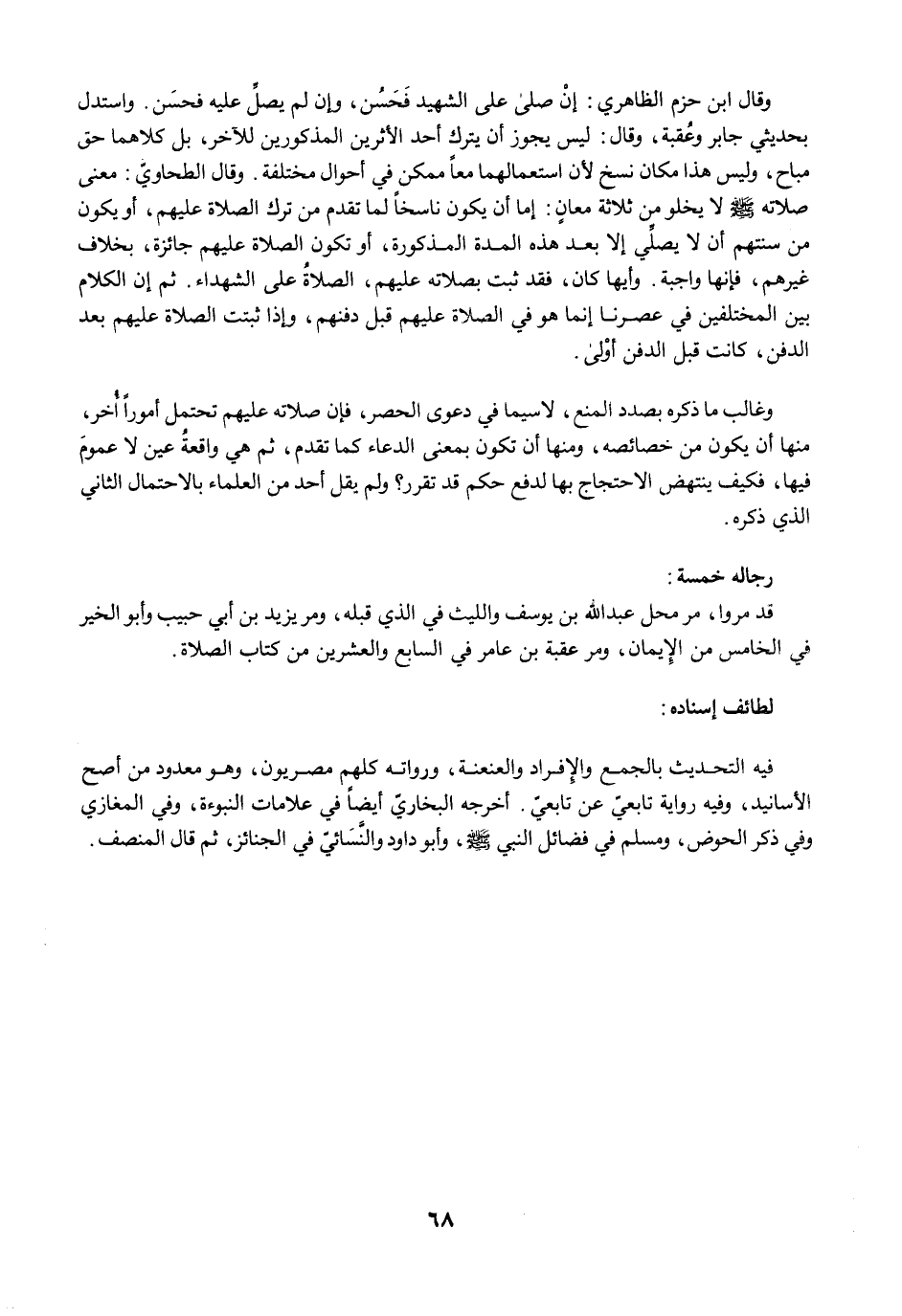 وقال ابن حزم الظاهري: إنْ صلى على الشهيد فَحَسُن، وإن لم يصلِّ عليه فحسَن. واستدل بحديثي جابر وعُقبة، وقال: ليس يجوز أن يترك أحد الأثرين المذكورين للآخر، بل كلاهما حق مباح، وليس هذا مكان نسخ لأن استعمالهما معًا ممكن في أحوال مختلفة. وقال الطحاويّ: معنى صلاته -صلى الله عليه وسلم- لا يخلو من ثلاثة معانٍ: إما أن يكون ناسخًا لما تقدم من ترك الصلاة عليهم، أو يكون من سنتهم أن لا يصلِّي إلا بعد هذه المدة المذكورة، أو تكون الصلاة عليهم جائزة، بخلاف غيرهم، فإنها واجبة. وأيها كان، فقد ثبت بصلاته عليهم، الصلاةُ على الشهداء. ثم إن الكلام بين المختلفين في عصرنا إنما هو في الصلاة عليهم قبل دفنهم، وإذا ثبتت الصلاة عليهم بعد الدفن، كانت قبل الدفن أوْلى.