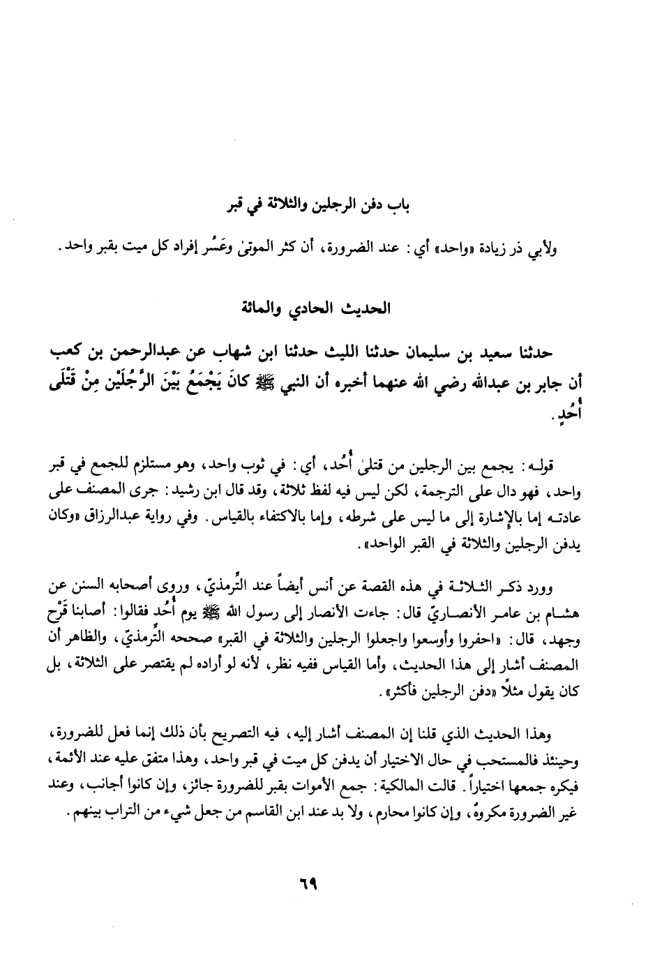 حَدَّثَنَا سَعِيدُ بْنُ سُلَيْمَانَ حَدَّثَنَا اللَّيْثُ حَدَّثَنَا ابْنُ شِهَابٍ عَنْ عَبْدِ الرَّحْمَنِ بْنِ كَعْبٍ أَنَّ جَابِرَ بْنَ عَبْدِ اللَّهِ رضي الله عنهما أَخْبَرَهُ أَنَّ النَّبِيَّ -صلى الله عليه وسلم- كَانَ يَجْمَعُ بَيْنَ الرَّجُلَيْنِ مِنْ قَتْلَى أُحُدٍ.