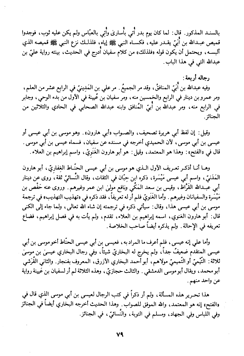 وأما علي إنه عيسى، فلم أعرف ما المراد به، فعيسى بن أبي عيسى الحنّاط أخو موسى بن أبي عيسى المتقدم ضعيفٌ جدًا، ولم يخرج له البخاري شيئًا، وفي رجال البخاري عيسى بن موسى ثلاثة: التّيْميّ أو التّميميّ مولاهم، أبو أحمد البخاري الأزرق، المعروف بفنجار. والثاني القُرَشي أبو محمد، ويقال أبو موسى الدمشقي. والثالث حجازيّ، وهذه الثلاثة لم أر لسفيان بن عَيينة رواية عن واحد منهم.
