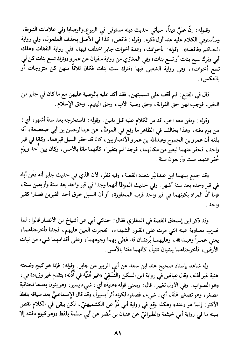 وقوله: إنّ عليَّ دينًا، سيأتي حديث دينه مستوفى في البيوع. والوصايا وفي علامات النبوءة، وسأستوفي الكلام عليه عند أول ذكره. وقوله: فاقض، كذا في الأصل بحذف المفعول، وفي رواية الحاكم "فاقضه". وقوله: بأخواتك، وعدة أخوات جابر اختلف فيها، ففي رواية النفقات "هلك أبي وترك سبع بنات أو تسع بنات" وفي المغازي من رواية سفيان عن عمرو "وترك تسع بنات كن لي تسع أخوات"، وفي رواية الشعبي فيها "فترك ست بنات فكان ثلاثًا منهن كن متزوجات أو بالعكس".