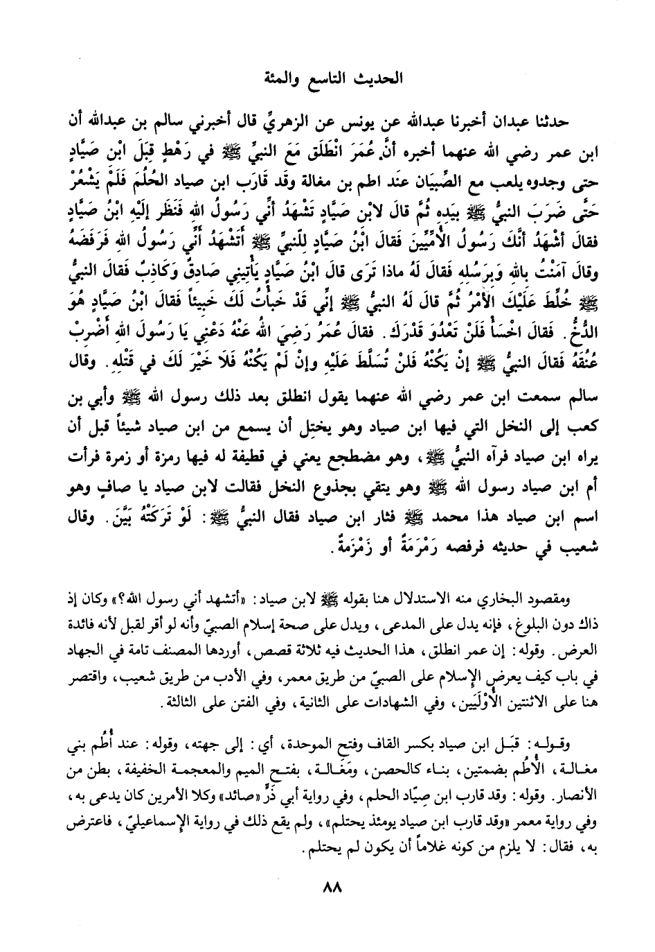 حَدَّثَنَا عَبْدَانُ أَخْبَرَنَا عَبْدُ اللَّهِ عَنْ يُونُسَ عَنِ الزُّهْرِيِّ قَالَ أَخْبَرَنِي سَالِمُ بْنُ عَبْدِ اللَّهِ أَنَّ ابْنَ عُمَرَ رضي الله عنهما أَخْبَرَهُ أَنَّ عُمَرَ انْطَلَقَ مَعَ النَّبِيِّ -صلى الله عليه وسلم- فِي رَهْطٍ قِبَلَ ابْنِ صَيَّادٍ، حَتَّى وَجَدُوهُ يَلْعَبُ مَعَ الصِّبْيَانِ عِنْدَ أُطُمِ بَنِ مَغَالَةَ، وَقَدْ قَارَبَ ابْنُ صَيَّادٍ الْحُلُمَ فَلَمْ يَشْعُرْ حَتَّى ضَرَبَ النَّبِيُّ -صلى الله عليه وسلم- بِيَدِهِ ثُمَّ قَالَ لاِبْنِ صَيَّادٍ تَشْهَدُ أَنِّي رَسُولُ اللَّهِ. فَنَظَرَ إِلَيْهِ ابْنُ صَيَّادٍ فَقَالَ أَشْهَدُ أَنَّكَ رَسُولُ الأُمِّيِّينَ. فَقَالَ ابْنُ صَيَّادٍ لِلنَّبِىِّ -صلى الله عليه وسلم- أَتَشْهَدُ أَنِّي رَسُولُ اللَّهِ فَرَفَضَهُ وَقَالَ آمَنْتُ بِاللَّهِ وَبِرُسُلِهِ. فَقَالَ لَهُ مَاذَا تَرَى. قَالَ ابْنُ صَيَّادٍ يَأْتِينِي صَادِقٌ وَكَاذِبٌ. فَقَالَ النَّبِيُّ -صلى الله عليه وسلم- خُلِّطَ عَلَيْكَ الأَمْرُ ثُمَّ قَالَ لَهُ النَّبِيُّ -صلى الله عليه وسلم- إِنِّي قَدْ خَبَأْتُ لَكَ خَبِيئًا. فَقَالَ ابْنُ صَيَّادٍ هُوَ الدُّخُّ. فَقَالَ اخْسَأْ، فَلَنْ تَعْدُوَ قَدْرَكَ. فَقَالَ عُمَرُ رضي الله عنه دَعْنِي يَا رَسُولَ اللَّهِ أَضْرِبْ عُنُقَهُ. فَقَالَ النَّبِيُّ -صلى الله عليه وسلم- إِنْ يَكُنْهُ فَلَنْ تُسَلَّطَ عَلَيْهِ، وَإِنْ لَمْ يَكُنْهُ فَلاَ خَيْرَ لَكَ فِي قَتْلِهِ. وَقَالَ سَالِمٌ سَمِعْتُ ابْنَ عُمَرَ رضي الله عنهما يَقُولُ انْطَلَقَ بَعْدَ ذَلِكَ رَسُولُ اللَّهِ -صلى الله عليه وسلم- وَأُبَيُّ بْنُ كَعْبٍ إِلَى النَّخْلِ الَّتِى فِيهَا ابْنُ صَيَّادٍ وَهُوَ يَخْتِلُ أَنْ يَسْمَعَ مِنِ ابْنِ صَيَّادٍ شَيْئًا قَبْلَ أَنْ يَرَاهُ ابْنُ صَيَّادٍ فَرَآهُ النَّبِيُّ -صلى الله عليه وسلم- وَهُوَ مُضْطَجِعٌ، يَعْنِي فِي قَطِيفَةٍ لَهُ فِيهَا رَمْزَةٌ أَوْ زَمْرَةٌ، فَرَأَتْ أُمُّ ابْنِ صَيَّادٍ رَسُولَ اللَّهِ -صلى الله عليه وسلم- وَهُوَ يَتَّقِي بِجُذُوعِ النَّخْلِ فَقَالَتْ لاِبْنِ صَيَّادٍ يَا صَافِ وَهْوَ اسْمُ ابْنِ صَيَّادٍ هَذَا مُحَمَّدٌ -صلى الله عليه وسلم-. فَثَارَ ابْنُ صَيَّادٍ فَقَالَ النَّبِيُّ -صلى الله عليه وسلم- لَوْ تَرَكَتْهُ بَيَّنَ. وَقَالَ شُعَيْبٌ فِي حَدِيثِهِ فَرَفَصَهُ رَمْرَمَةٌ، أَوْ زَمْزَمَةٌ.