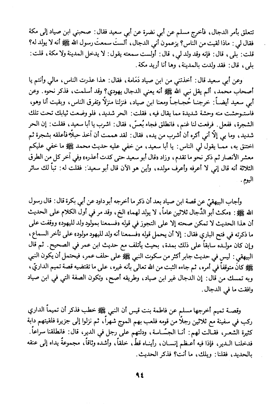 وأجاب البيهقيّ عن قصة ابن صياد بعد أن ذكر ما أخرجه أبو داود عن أبي بكرة قال: قال رسول الله -صلى الله عليه وسلم-: "مكث أبو الدَّجال ثلاثين عامًا، لا يولد لهما" الخ، وقد مرَّ في أول الكلام على الحديث أن هذا الحديث لا تمكن صحته إلا على التجوز في قوله "فسمعنا بمولود ولد لليهود" ووقفت على ما ذكرته في فتح الباري فقال: إلا أن يحمل قوله "فسمعنا أنه ولد لليهود مولود" على تأخر السماع، وإن كان مولده سابقًا على ذلك بمدة، بحيث يأتلف مع حديث ابن عمر في الصحيح. ثم قال البيهقي: ليس في حديث جابر أكثر من سكوت النبي -صلى الله عليه وسلم- على حلف عمر، فيحتمل أن يكون النبي -صلى الله عليه وسلم- كانَ متوقفًا في أمره، ثم جاءه الثبت من الله تعالى بأنه غيره، على ما تقتضيه قصة تميم الداريّ، وبه تمسك من قال: إن الدجال غير ابن صياد، وطريقه أصح، وتكون الصفة التي في ابن صياد وافقت ما في الدجال.