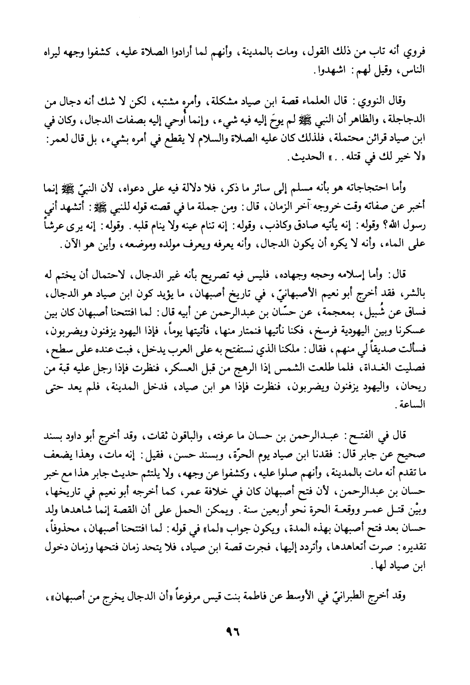 قال: وأما إسلامه وحجه وجهاده، فليس فيه تصريح بأنه غير الدجال، لاحتمال أن يختم له بالشر، فقد أخرج أبو نعيم الأصبهانيّ، في تاريخ أصبهان، ما يؤيد كون ابن صياد هو الدجال، فساق عن شُبيل، بمعجمة، عن حسّان بن عبد الرحمن عن أبيه قال: لما افتتحنا أصبهان كان بين عسكرنا وبين اليهودية فرسخ، فكنا نأتيها فنمتار منها، فأتيتها يومًا، فإذا اليهود يزفنون ويضربون، فسألت صديقًا لي منهم، فقال: ملكنا الذي نستفتح به على العرب يدخل، فبت عنده على سطح، فصليت الغداة، فلما طلعت الشمس إذا الرهج من قبل العسكر، فنظرت فإذا رجل عليه قبة من ريحان، واليهود يزفنون ويضربون، فنظرت فإذا هو ابن صياد، فدخل المدينة، فلم يعد حتى الساعة.
