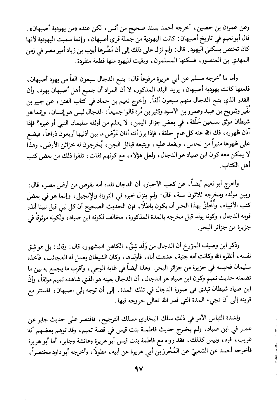 وأما ما أخرجه مسلم عن أبي هريرة مرفوعًا قال: يتبع الدجال سبعون الفًا من يهود أصبهان، فلعلها كانت يهودية أصبهان، يريد البلد المذكور، لا أن المراد أن جميع أهل أصبهان يهود، وأن القدر الذي يتبع الدجال منهم سبعون ألفًا. وأخرج نعيم بن حماد في كتاب الفتن، عن جبير بن نُفَير وشريح بن عبيد وعمرو بن الأسود وكثير بن مُرة قالوا جميعًا: الدجال ليس هو إنسان، وإنما هو شيطان موثق بسبعين حَلْقة، في بعض جزائر اليمن، لا يعلم من أوثقه سليمان النبي أو غيره؟ فإذا آذن ظهوره، فك الله عنه كل عامٍ حلقة، فإذا برز أتته أتان عَرْض ما بين أذنيها أربعون ذراعًا، فيضع على ظهرها منبرًا من نحاس، ويقعد عليه، ويتبعه قبائل الجن، يُخرجون له خزائن الأرض، وهذا لا يمكن معه كون ابن صياد هو الدجال، ولعل هؤلاء، مع كونهم ثقات، تلقوا ذلك من بعض كتب أهل الكتاب.