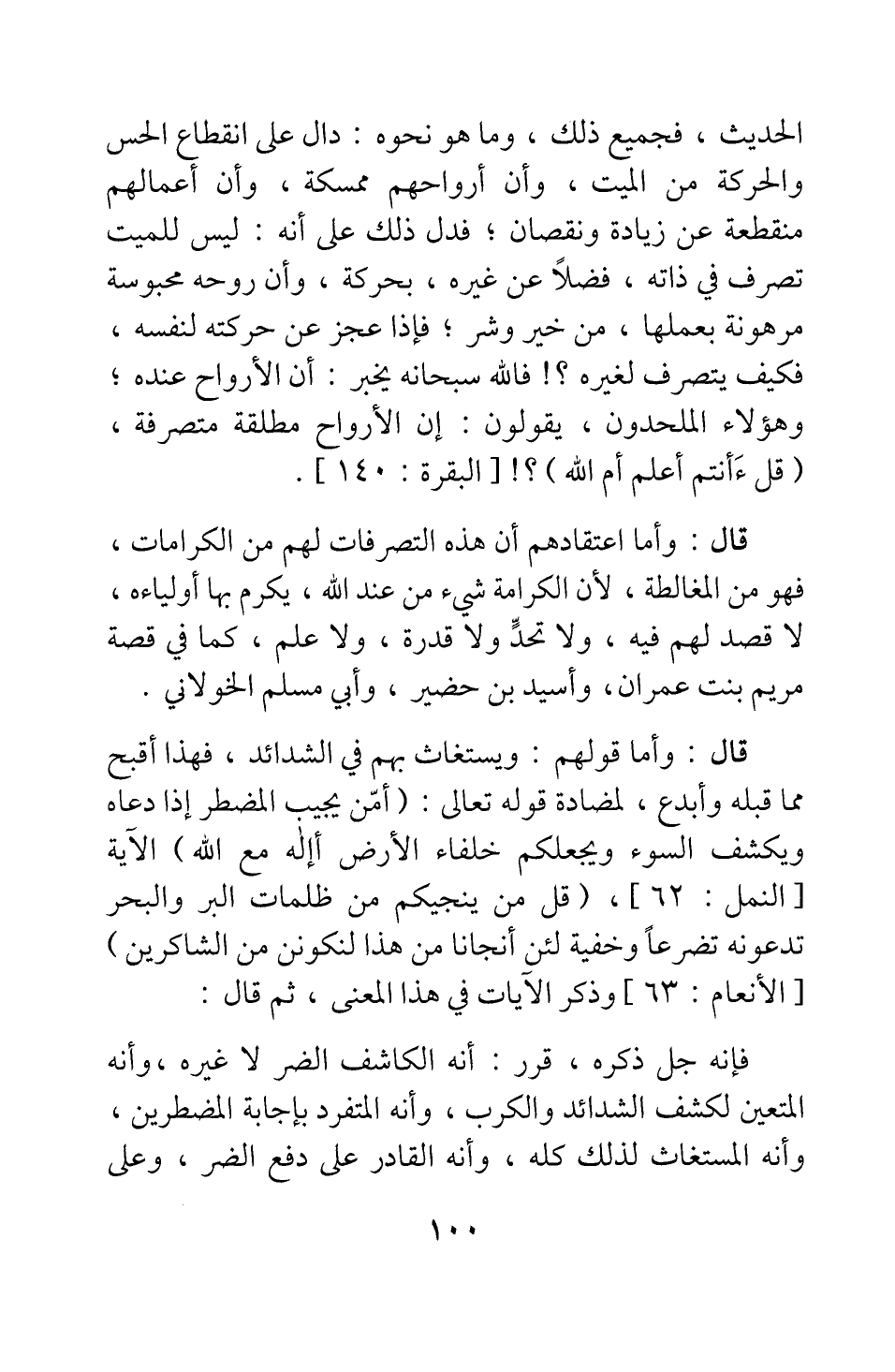 الحديث؛ فجميع ذلك، وما هو نحوه دال على انقطاع الحس والحركة من الميت، وأن أرواحهم ممسكة، وأن أعمالهم منقطعة عن زيادة ونقصان، فدل ذلك على أنه ليس للميت تصرف في ذاته، فضلا عن غيره، بحركة، وأن روحه محبوسة مرهونة بعملها، من خير وشر؛ فإذا عجز عن حركته لنفسه، فكيف يتصرف لغيره؟! فالله سبحانه يخبر أن الأرواح عنده; وهؤلاء الملحدون، يقولون: إن الأرواح مطلقة متصرفة، {قُلْ أَأَنْتُمْ أَعْلَمُ أَمِ اللَّهُ} [سورة البقرة آية: 140] ؟!