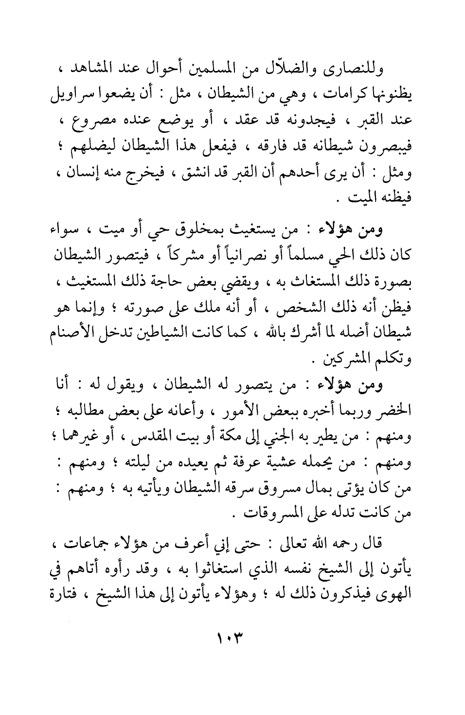 ومن هؤلاء: من يستغيث بمخلوق حي أو ميت، سواء كان ذلك الحي مسلما أو نصرانيا أو مشركا، فيتصور الشيطان بصورة ذلك المستغاث به، ويقضي بعض حاجة ذلك المستغيث، فيظن أنه ذلك الشخص، أو أنه ملك على صورته ; وإنما هو شيطان أضله لما أشرك بالله، كما كانت الشياطين تدخل الأصنام وتكلم المشركين.