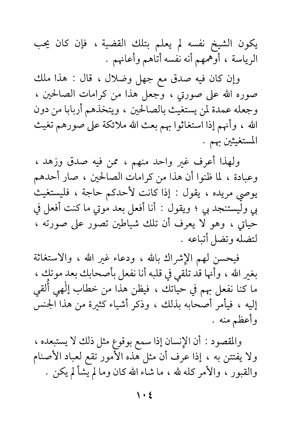 ولهذا أعرف غير واحد منهم، ممن فيه صدق وزهد وعبادة، لما ظنوا أن هذا من كرامات الصالحين، صار أحدهم يوصي مريده، يقول: إذا كانت لأحدكم حاجة، فليستغث بي وليستنجد بي ; ويقول: أنا أفعل بعد موتي ما كنت أفعل في حياتي؛ وهو لا يعرف أن تلك شياطين تصور على صورته، لتضله وتضل أتباعه.