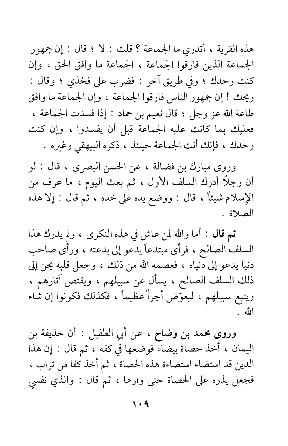هذه القرية، أتدري ما الجماعة؟ قلت: لا ; قال: إن جمهور الجماعة الذين فارقوا الجماعة. الجماعة ما وافق الحق، وإن كنت وحدك. وفي طريق آخر: فضرب على فخذي، وقال: ويحك! إن جمهور الناس فارقوا الجماعة، وإن الجماعة ما وافق طاعة الله عز وجل". قال نعيم بن حماد: "إذا فسدت الجماعة، فعليك بما كانت عليه الجماعة قبل أن يفسدوا، وإن كنت وحدك، فإنك أنت الجماعة حينئذ" ذكره البيهقي وغيره.