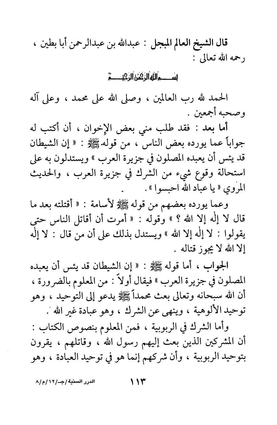 أما بعد: فقد طلب مني بعض الإخوان، أن أكتب له جوابا عما يورده بعض الناس، من قوله صلى الله عليه وسلم: " إن الشيطان قد يئس أن يعبده المصلون في جزيرة العرب " 1، ويستدلون به على استحالة وقوع شيء من الشرك في جزيرة العرب، والحديث المروي " يا عباد الله احبسوا".وعما يورده بعضهم من قوله صلى الله عليه وسلم لأسامة: "أقتلته بعد ما قال لا إله إلا الله؟ " 2، وقوله: " أمرت أن أقاتل الناس حتى يقولوا: لا إله إلا الله " 3؛ ويستدل بذلك على أن من قال: لا إله إلا الله لا يجوز قتاله.