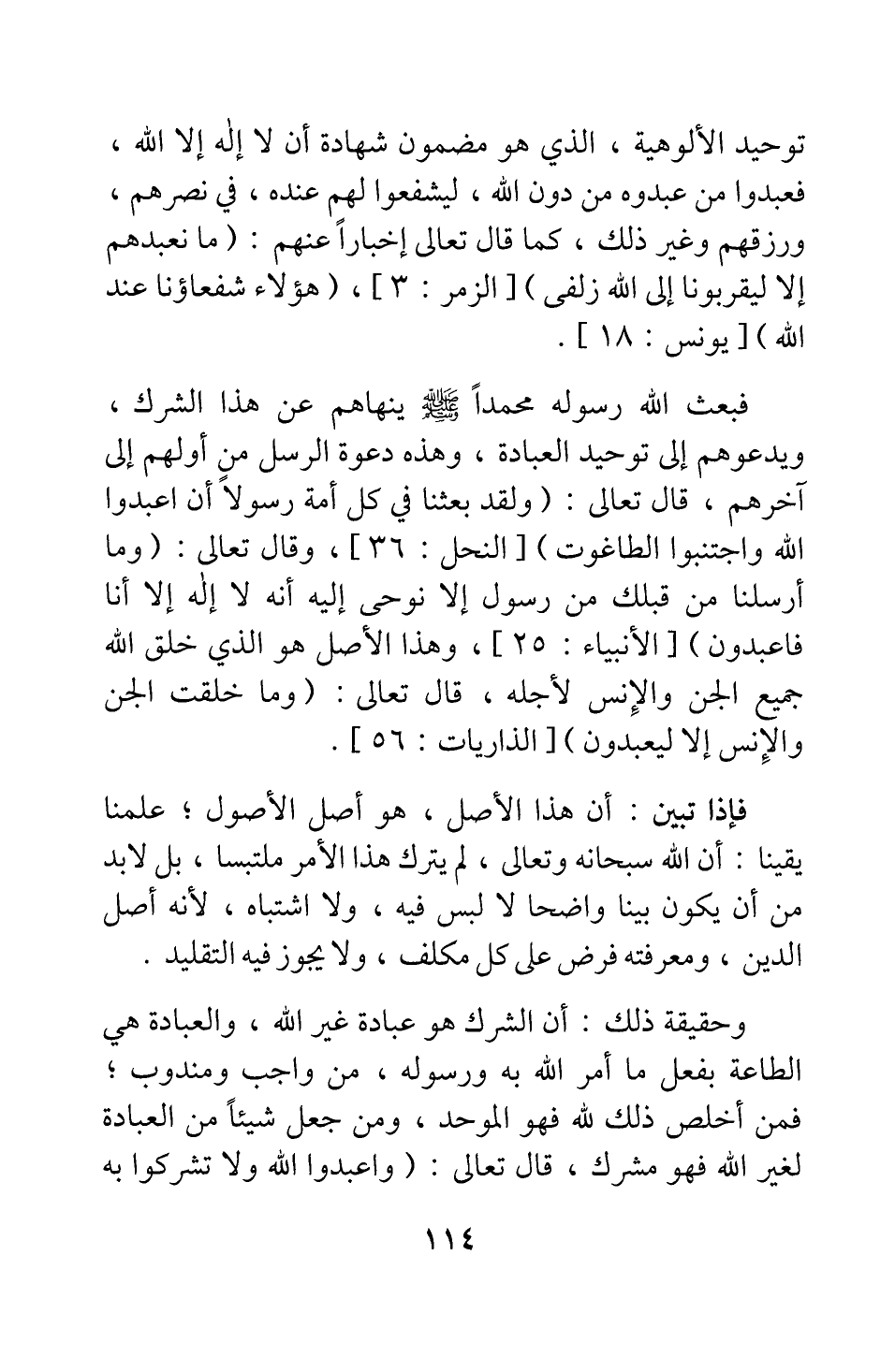 فبعث الله رسوله محمدا صلى الله عليه وسلم ينهاهم عن هذا الشرك، ويدعوهم إلى توحيد العبادة؛ وهذه دعوة الرسل من أولهم إلى آخرهم، قال تعالى: {وَلَقَدْ بَعَثْنَا فِي كُلِّ أُمَّةٍ رَسُولاً أَنِ اعْبُدُوا اللَّهَ وَاجْتَنِبُوا الطَّاغُوتَ} [سورة النحل آية: 36] ، وقال تعالى: {وَمَا أَرْسَلْنَا مِنْ قَبْلِكَ مِنْ رَسُولٍ إِلاَّ نُوحِي إِلَيْهِ أَنَّهُ لا إِلَهَ إِلاَّ أَنَا فَاعْبُدُونِ} [سورة الأنبياء آية: 25] . وهذا الأصل هو الذي خلق الله جميع الجن والإنس لأجله، قال تعالى: {وَمَا خَلَقْتُ الْجِنَّ وَالأِنْسَ إِلاَّ لِيَعْبُدُونِ} [سورة الذاريات آية: 56] .