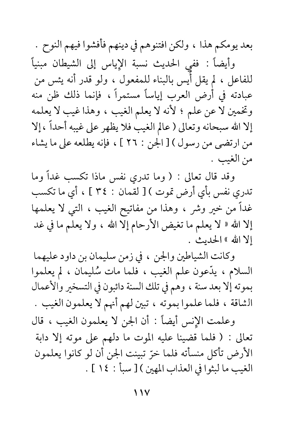 وكانت الشياطين والجن، في زمن سليمان بن داود عليهما السلام، يدعون علم الغيب، فلما مات سليمان، لم يعلموا بموته إلا بعد سنة، وهم في تلك السنة دائبون في التسخير والأعمال الشاقة، فلما علموا بموته؛ تبين لهم أنهم لا يعلمون الغيب.