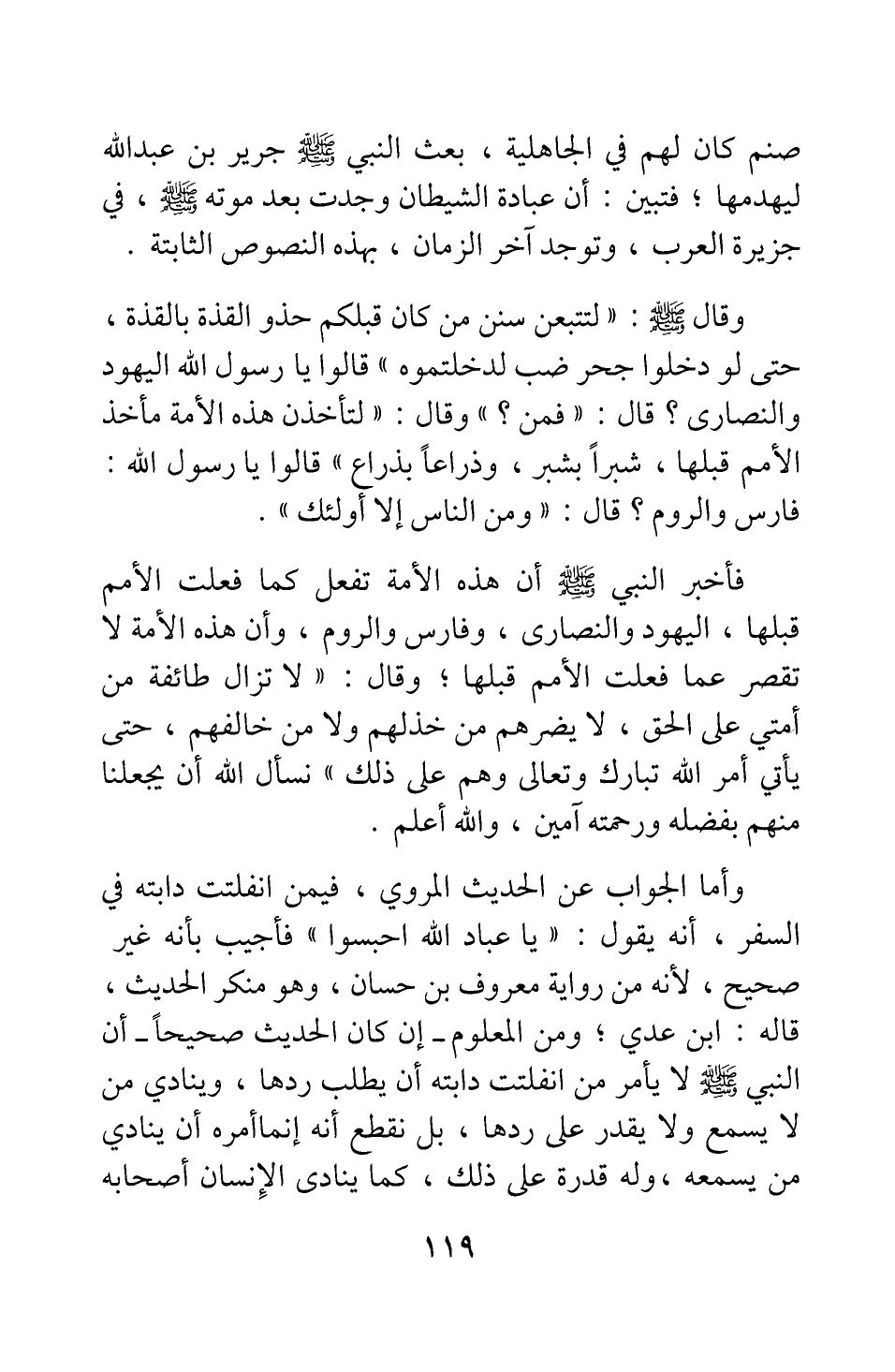 صنم كان لهم في الجاهلية، بعث النبي صلى الله عليه وسلم جرير بن عبد الله ليهدمها ; فتبين أن عبادة الشيطان وجدت بعد موته صلى الله عليه وسلم في جزيرة العرب، وتوجد آخر الزمان، بهذه النصوص الثابتة.