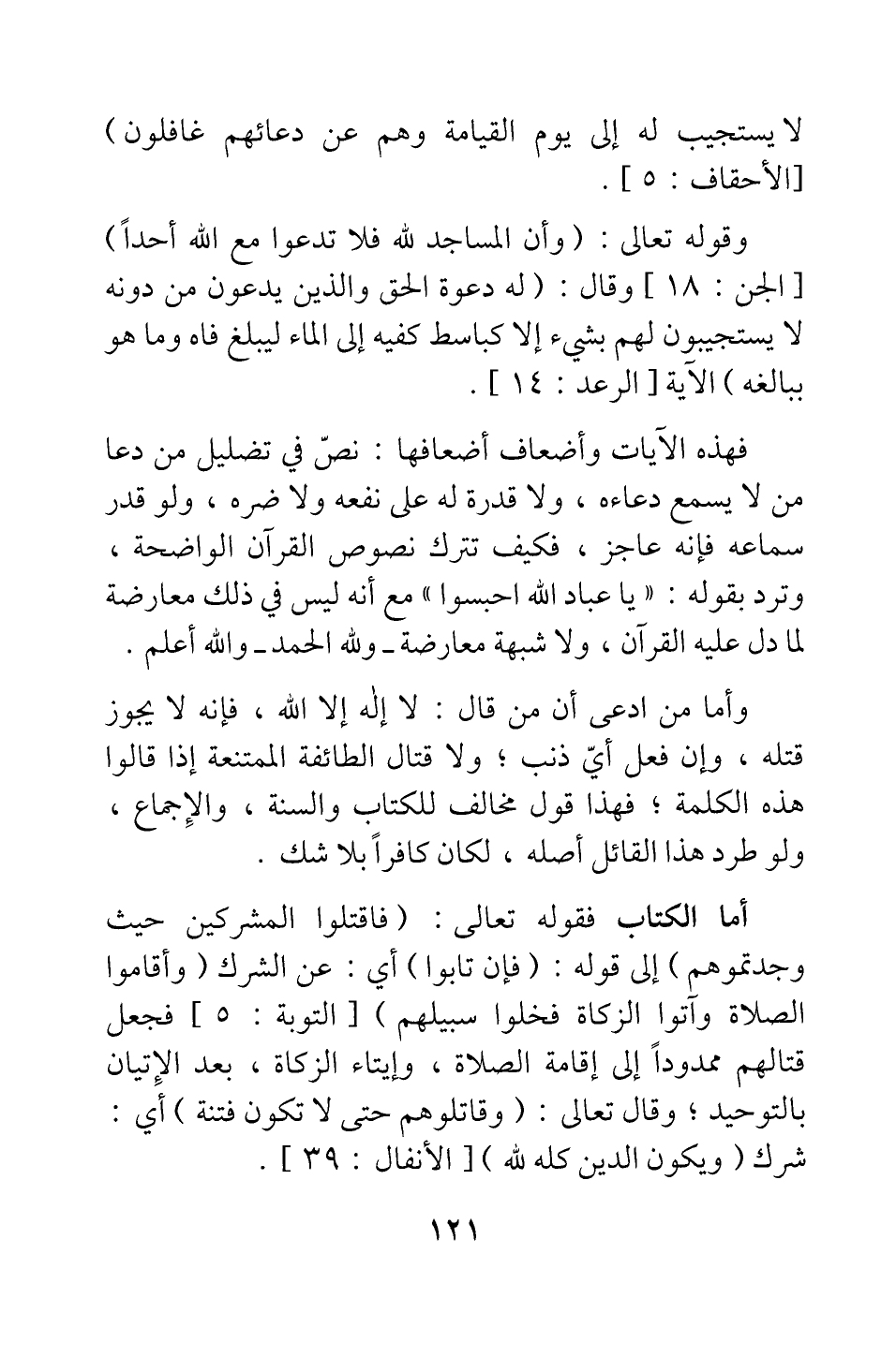 فهذه الآيات وأضعاف أضعافها نص في تضليل من دعا من لا يسمع دعاءه، ولا قدرة له على نفعه ولا ضره، ولو قدر سماعه فإنه عاجز؛ فكيف تترك نصوص القرآن الواضحة، وترد لقوله: "يا عباد الله احبسوا! "، مع أنه ليس في ذلك معارضة لما دل عليه القرآن، ولا شبهة معارضة - ولله الحمد -، والله أعلم.