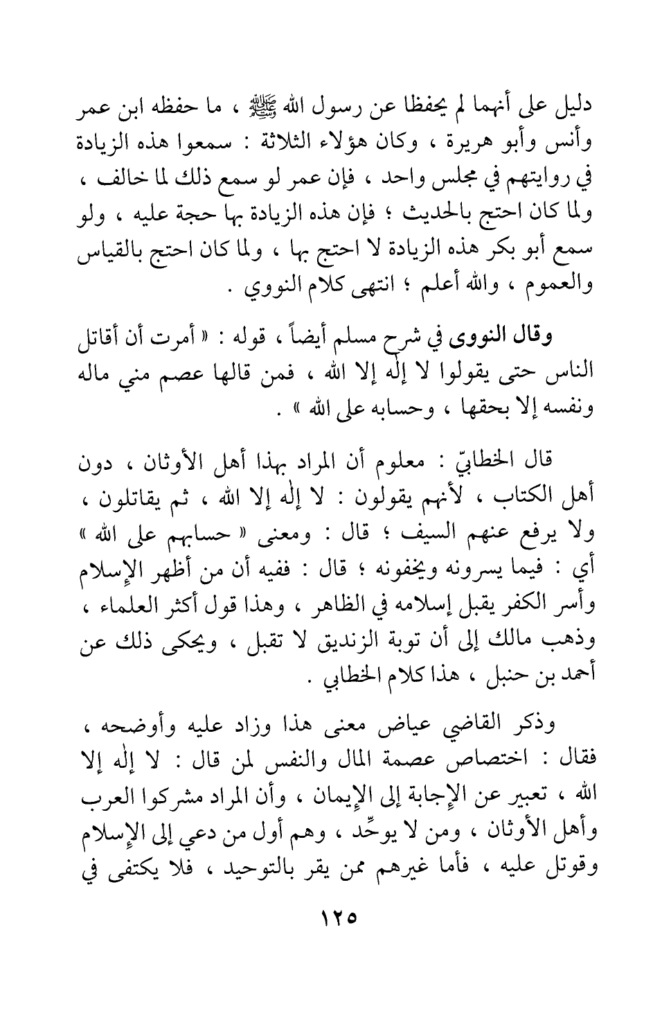 قال الخطابي: معلوم أن المراد بهذا أهل الأوثان، دون أهل الكتاب، لأنهم يقولون: لا إله إلا الله، ثم يقاتلون، ولا يرفع عنهم السيف ; قال: ومعنى حسابهم على الله أي: فيما يسرونه ويخفونه ; قال: ففيه أن من أظهر الإسلام وأسر الكفر يقبل إسلامه في الظاهر؛ وهذا قول أكثر العلماء، وذهب مالك إلى أن توبة الزنديق لا تقبل، ويحكى ذلك عن أحمد بن حنبل، هذا كلام الخطابي.