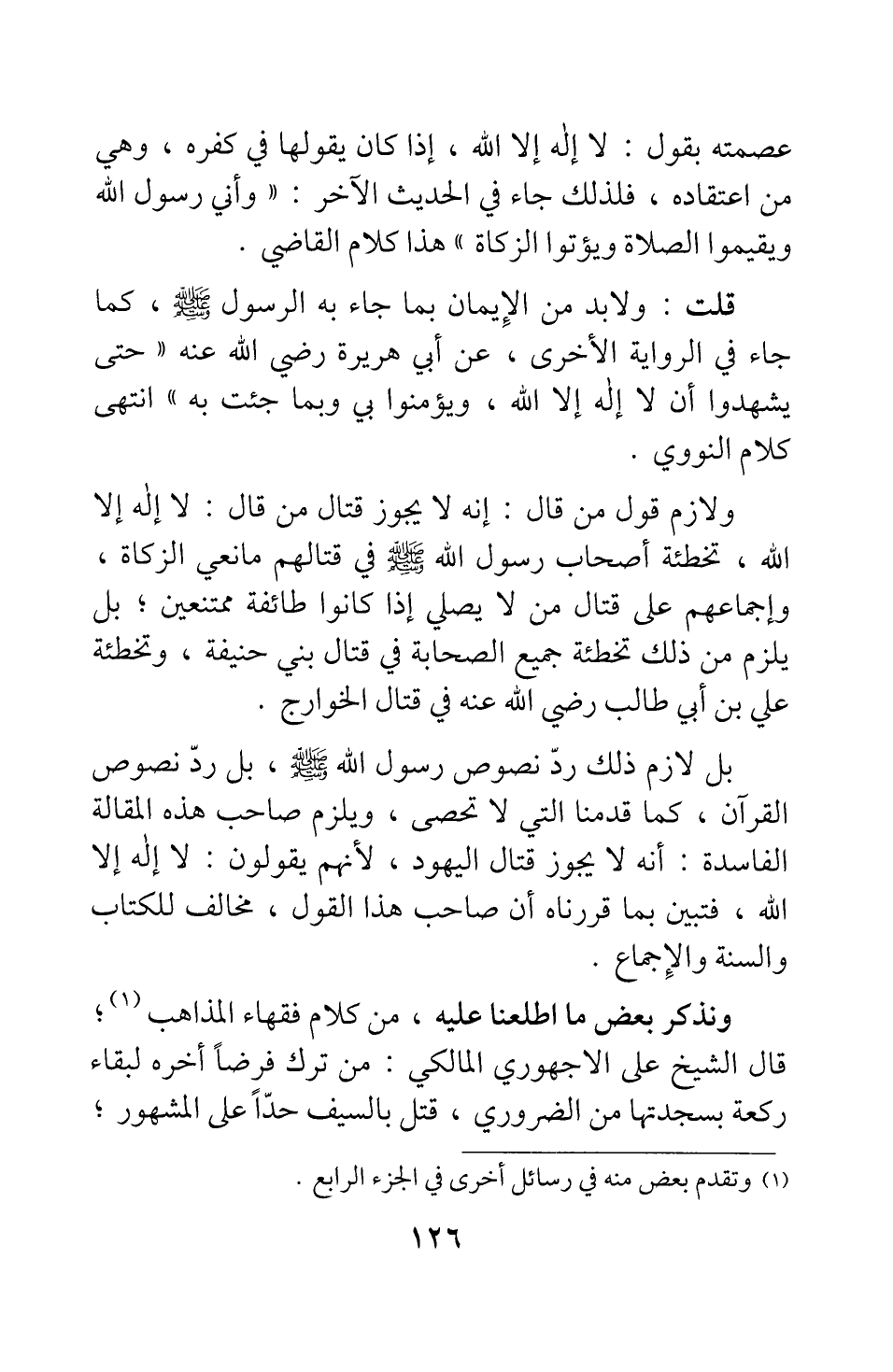 ولازم قول من قال: إنه لا يجوز قتال من قال: لا إله إلا الله، تخطئة أصحاب رسول الله صلى الله عليه وسلم في قتالهم مانعي الزكاة، وإجماعهم على قتال من لا يصلي إذا كانوا طائفة ممتنعين ; بل يلزم من ذلك تخطئة جميع الصحابة في قتال بني حنيفة، وتخطئة علي بن أبي طالب رضي الله عنه في قتال الخوارج.