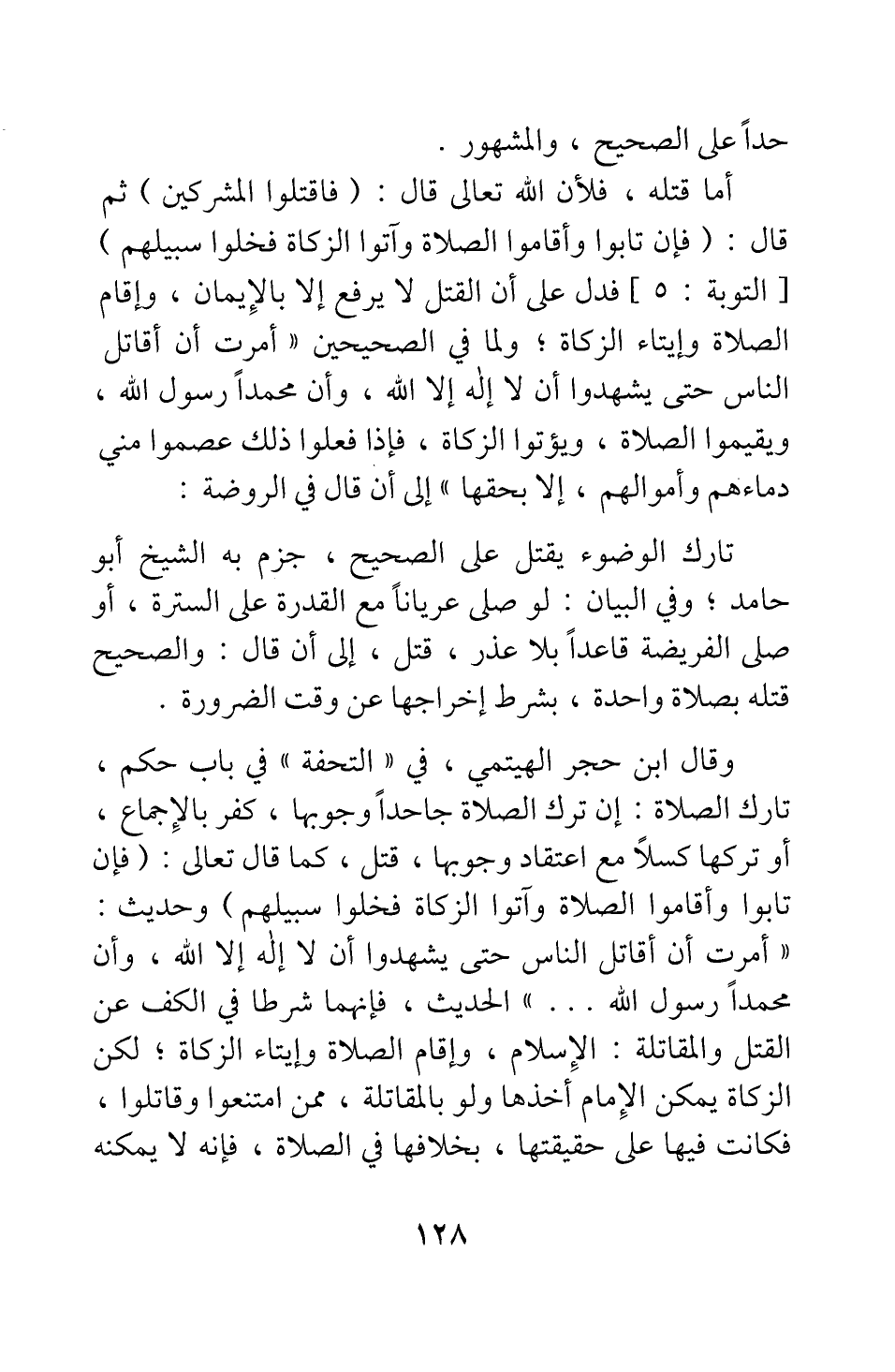 وقال ابن حجر الهيتمي، في "التحفة" في باب: حكم تارك الصلاة: إن ترك الصلاة جاحدا وجوبها، كفر بالإجماع، أو تركها كسلا مع اعتقاد وجوبها، قتل، كما قال تعالى: {فَإِنْ تَابُوا وَأَقَامُوا الصَّلاةَ وَآتَوُا الزَّكَاةَ فَخَلُّوا سَبِيلَهُمْ} [سورة التوبة آية: 5] ، وحديث: " أمرت أن أقاتل الناس حتى يشهدوا أن لا إله إلا الله، وأن محمدا رسول الله ... " 2 الحديث؛ فإنهما شرطا في الكف عن القتل والمقاتلة: الإسلام، وإقام الصلاة وإيتاء الزكاة، لكن الزكاة يمكن الإمام أخذها ولو بالمقاتلة، ممن امتنعوا وقاتلوا، فكانت فيها على حقيقتها، بخلافها في الصلاة، فإنه لا يمكنه