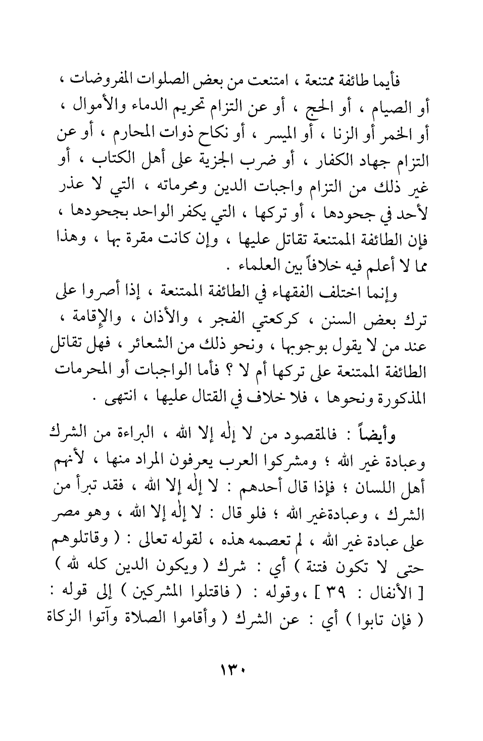 فأيما طائفة ممتنعة، امتنعت من بعض الصلوات المفروضات، أو الصيام، أو الحج، أو عن التزام تحريم الدماء والأموال، أو الخمر أو الزنى، أو الميسر، أو نكاح ذوات المحارم، أو عن التزام جهاد الكفار، أو ضرب الجزية على أهل الكتاب، أو غير ذلك من التزام واجبات الدين ومحرماته، التي لا عذر لأحد في جحودها، أو تركها، التي يكفر الواحد بجحودها، فإن الطائفة الممتنعة تقاتل عليها، وإن كانت مقرة بها؛ وهذا مما لا أعلم فيه خلافا بين العلماء.