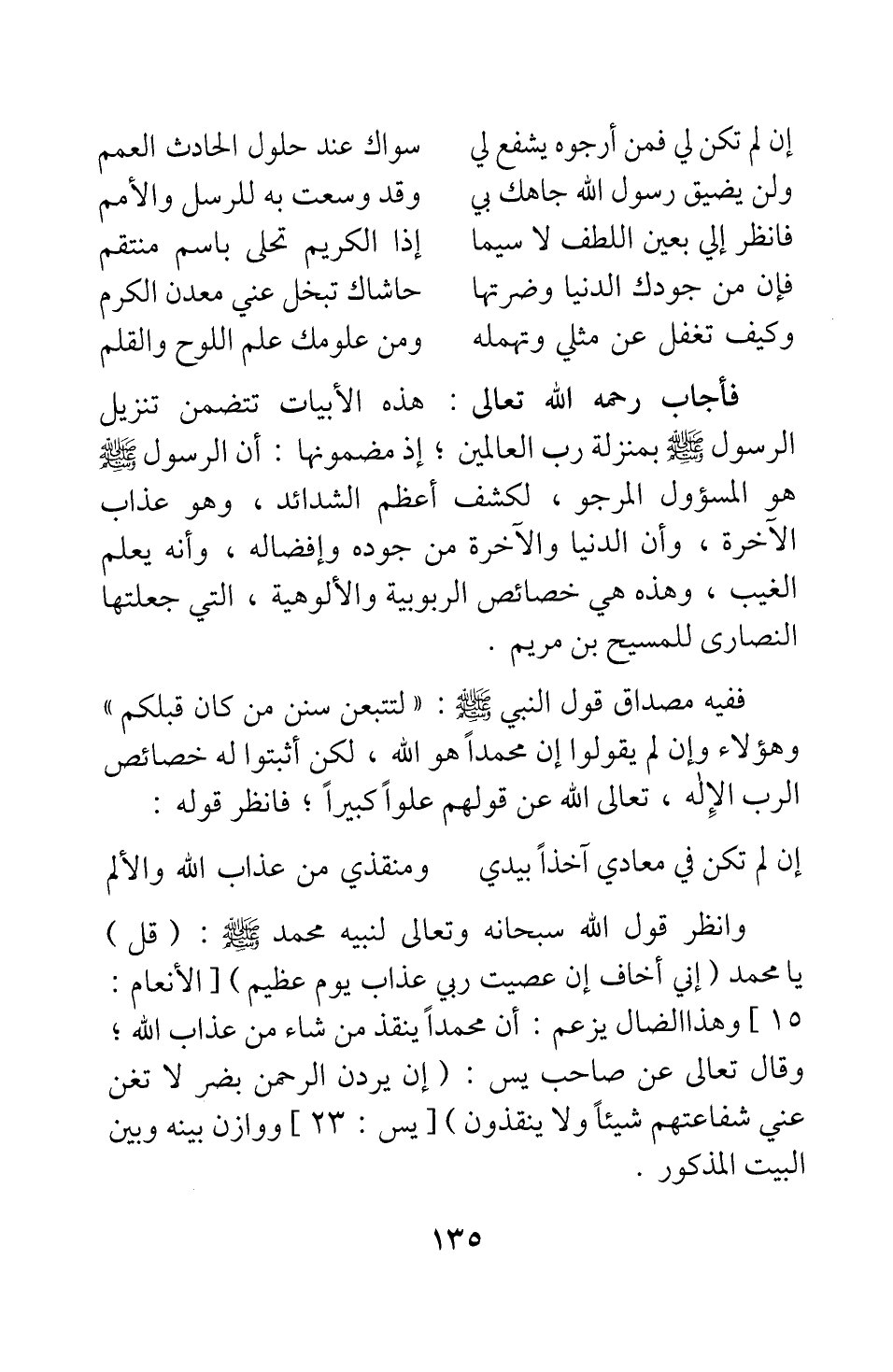 وانظر قول الله سبحانه وتعالى لنبيه محمد صلى الله عليه وسلم: {قُلْ} [سورة الأنعام آية: 15] يا محمد: {إِنِّي أَخَافُ إِنْ عَصَيْتُ رَبِّي عَذَابَ يَوْمٍ عَظِيمٍ} [سورة الأنعام آية:15] . وهذا الضال يزعم أن محمدا ينقذ من شاء من عذاب الله ; وقال تعالى عن صاحب يس: {إِنْ يُرِدْنِ الرَّحْمَنُ بِضُرٍّ لا تُغْنِ عَنِّي شَفَاعَتُهُمْ شَيْئاً وَلا يُنْقِذُونِ} [سورة يس آية: 23] ، ووازن بينه وبين البيت المذكور.