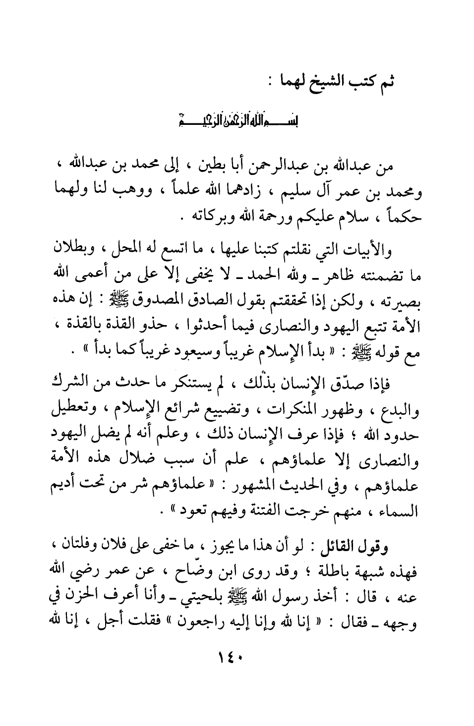 والأبيات التي نقلتم كتبنا عليها، ما اتسع له المحل، وبطلان ما تضمنته ظاهر - ولله الحمد - لا يخفى إلا على من أعمى الله بصيرته، ولكن إذا تحققتم بقول الصادق المصدوق صلى الله عليه وسلم أن هذه الأمة تتبع اليهود والنصارى فيما أحدثوا، حذو القذة بالقذة، مع قوله صلى الله عليه وسلم: " بدأ الإسلام غريبا وسيعود غريبا كما بدأ " 1، فإذا صدّق الإنسان بذلك، لم يستنكر ما حدث من الشرك والبدع، وظهور المنكرات، وتضييع شرائع الإسلام، وتعطيل حدود الله، فإذا عرف الإنسان ذلك، وعلم أنه لم يضل اليهود والنصارى إلا علماؤهم، علم أن سبب ضلال هذه الأمة علماؤهم، وفي الحديث المشهور: " علماؤهم شر من تحت أديم السماء، منهم خرجت الفتنة وفيهم تعود ".