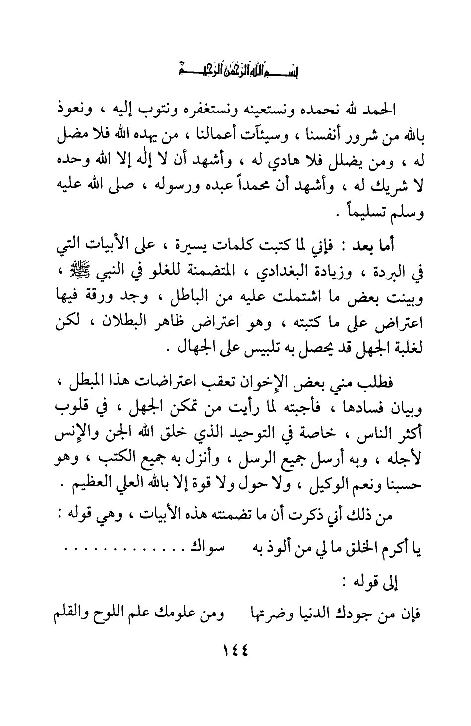 أما بعد: فإني لما كتبت كلمات يسيرة على الأبيات التي في البردة، وزيادة البغدادي المتضمنة للغلو في النبي صلى الله عليه وسلم، وبينت بعض ما اشتملت عليه من الباطل، وجد ورقة فيها اعتراض على ما كتبته، وهو اعتراض ظاهر البطلان، لكن لغلبة الجهل قد يحصل به تلبيس على الجهال.