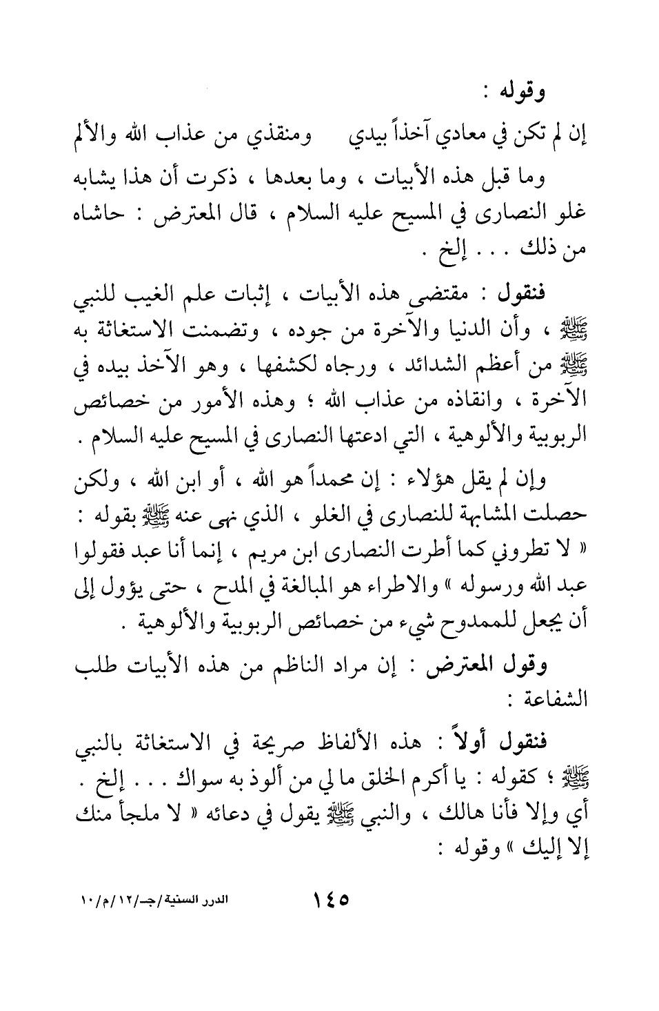 فنقول: مقتضى هذه الأبيات، إثبات علم الغيب للنبي صلى الله عليه وسلم، وأن الدنيا والآخرة من جوده، وتضمنت الاستغاثة به صلى الله عليه وسلم من أعظم الشدائد، ورجاه لكشفها، وهو الآخذ بيده في الآخرة، وإنقاذه من عذاب الله ; وهذه الأمور من خصائص الربوبية والألوهية، التي ادعتها النصارى في المسيح عليه السلام.