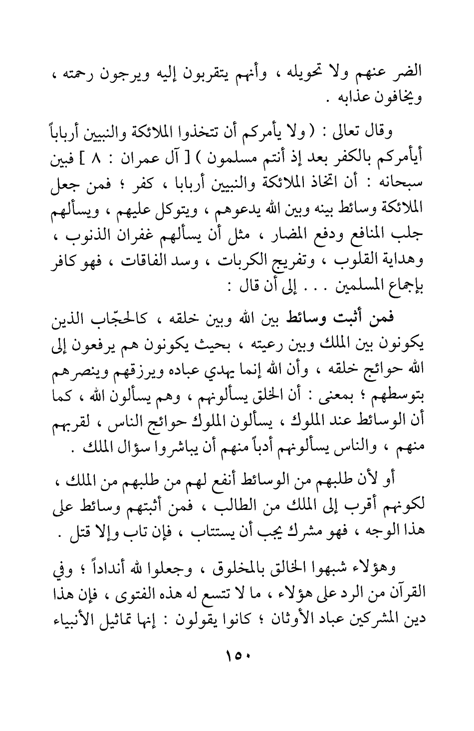 وقال تعالى: {وَلا يَأْمُرَكُمْ أَنْ تَتَّخِذُوا الْمَلائِكَةَ وَالنَّبِيِّينَ أَرْبَاباً أَيَأْمُرُكُمْ بِالْكُفْرِ بَعْدَ إِذْ أَنْتُمْ مُسْلِمُونَ} [سورة آل عمران آية: 80] ، فبين سبحانه أن اتخاذ الملائكة والنبيين أربابا، كفر ; فمن جعل الملائكة وسائط بينه وبين الله يدعوهم، ويتوكل عليهم، ويسألهم جلب المنافع ودفع المضار، مثل أن يسألهم غفران الذنوب، وهداية القلوب، وتفريج الكربات، وسد الفاقات، فهو كافر بإجماع المسلمين ... إلى أن قال: