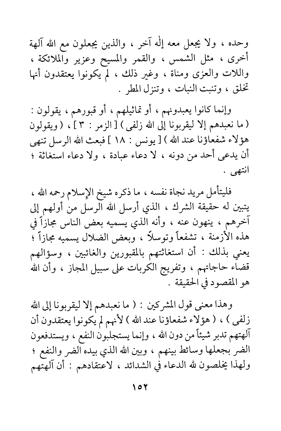 فليتأمل مريد نجاة نفسه، ما ذكره شيخ الإسلام رحمه الله، يتبين له حقيقة الشرك، الذي أرسل الله الرسل من أولهم إلى آخرهم، ينهون عنه، وأنه الذي يسميه بعض الناس مجازا في هذه الأزمنة تشفعا وتوسلا، وبعض الضّلاّل يسميه مجازا; يعني بذلك أن استغاثتهم بالمقبورين والغائبين، وسؤالهم قضاء حاجاتهم، وتفريج الكربات على سبيل المجاز، وأن الله هو المقصود في الحقيقة.