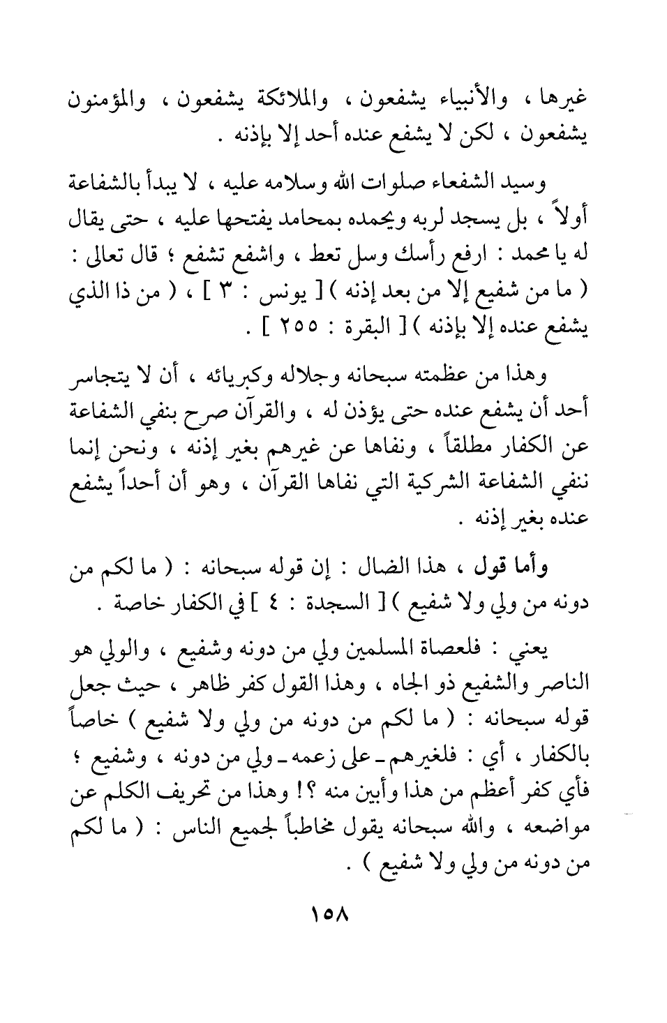 وأما قول هذا الضال: إن قوله سبحانه: {مَا لَكُمْ مِنْ دُونِهِ مِنْ وَلِيٍّ وَلا شَفِيعٍ} [سورة السجدة آية: 4] في الكفار خاصة،