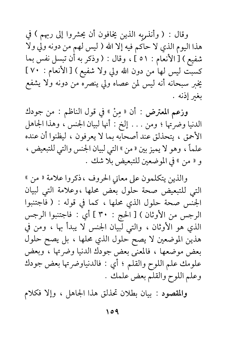 وزعم المعترض أن "من" في قول الناظم: من جودك الدنيا وضرتها، ومن ... إلخ: أنها لبيان الجنس، وهذا الجاهل الأحمق، يتحذلق عند أصحابه بما لا يعرفون، ليظنوا أن عنده علما، وهو لا يميز بين "من" التي لبيان الجنس والتي للتبعيض، و "من" في الموضعين للتبعيض بلا شك.