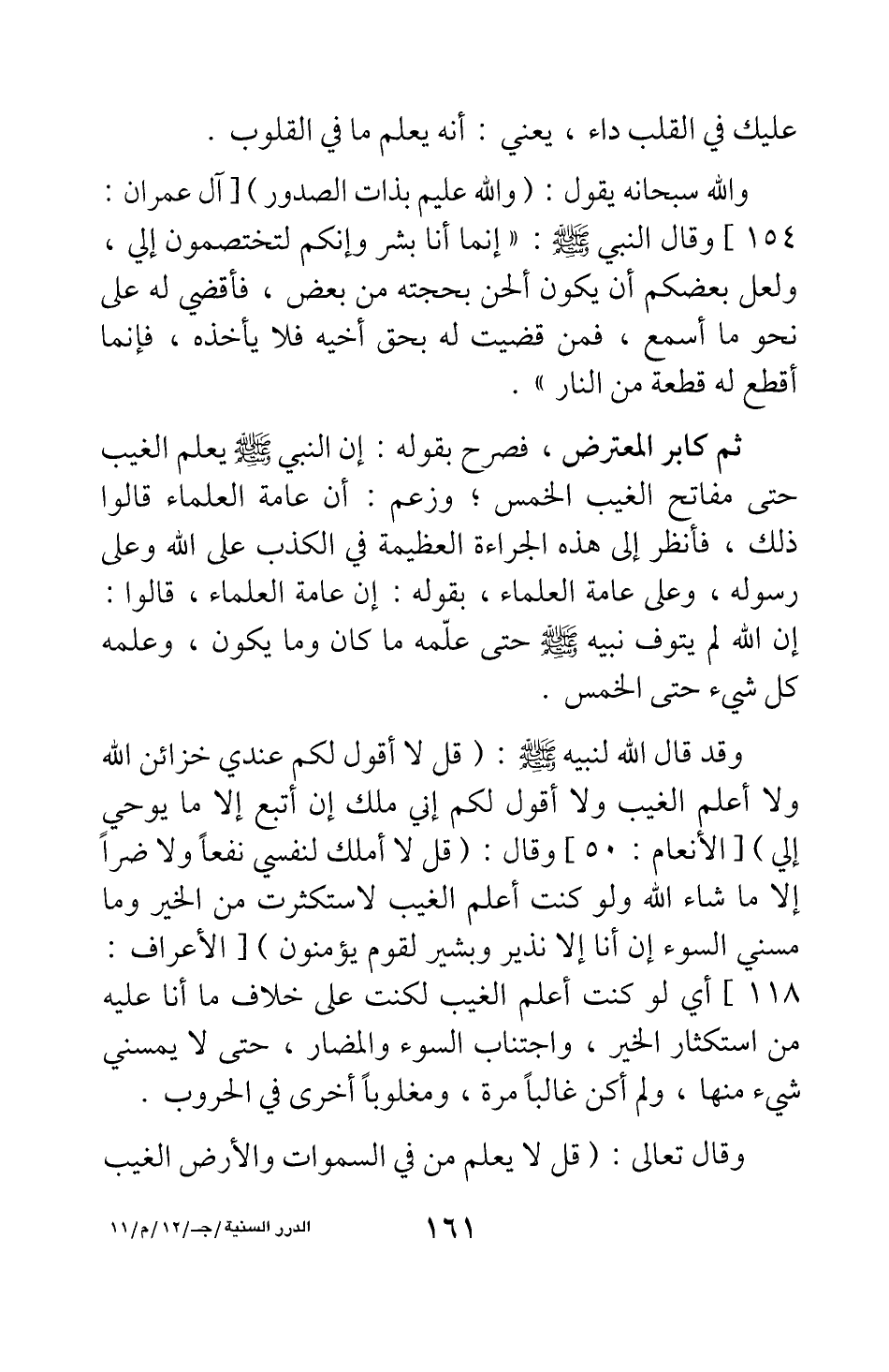 ثم كابر المعترض، فصرح بقوله: إن النبي صلى الله عليه وسلم يعلم الغيب حتى مفاتح الغيب الخمس، وزعم أن عامة العلماء قالوا ذلك؛ فانظر إلى هذه الجراءة العظيمة في الكذب على الله وعلى رسوله، وعلى عامة العلماء، بقوله: إن عامة العلماء قالوا: إن الله لم يتوف نبيه صلى الله عليه وسلم حتى علمه ما كان وما يكون، وعلمه كل شيء حتى الخمس.