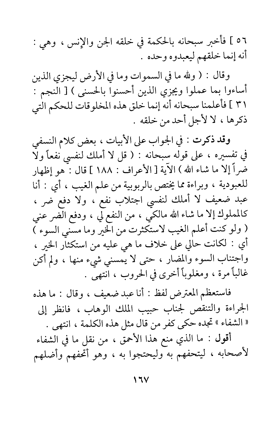 وقد ذكرت في الجواب على الأبيات، بعض كلام النسفي في تفسيره، على قوله سبحانه: {قُلْ لا أَمْلِكُ لِنَفْسِي نَفْعاً وَلا ضَرّاً إِلَّا مَا شَاءَ اللَّهُ} الآية [سورة الأعراف آية: 188] ، قال: هو إظهار للعبودية، وبراءة مما يختص بالربوبية من علم الغيب، أي: أنا عبد ضعيف لا أملك لنفسي اجتلاب نفع، ولا دفع ضر، كالمملوك إلا ما شاء الله مالكي، من النفع لي، ودفع الضر عني، {وَلَوْ كُنْتُ أَعْلَمُ الْغَيْبَ لَاسْتَكْثَرْتُ مِنَ الْخَيْرِ وَمَا مَسَّنِيَ السُّوءُ} [سورة الأعراف آية: 188] أي: لكانت حالي على خلاف ما هي عليه من استكثار الخير، واجتناب السوء والمضار، حتى لا يمسني شيء منها، ولم أكن غالبا مرة، ومغلوبا أخرى في الحروب، انتهى.