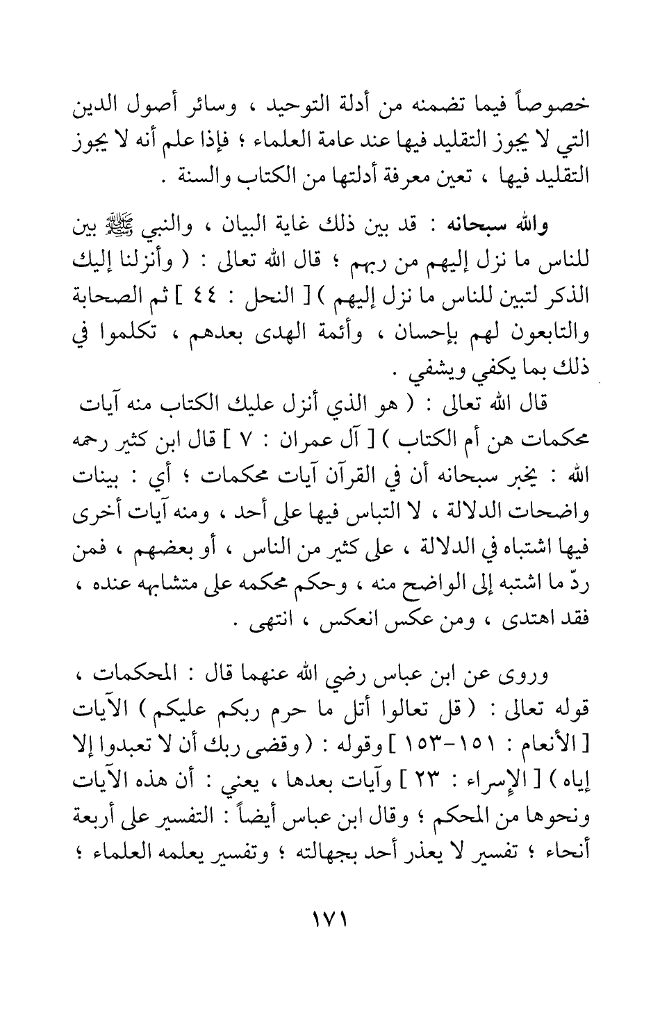 وقوله: {وَقَضَى رَبُّكَ أَلَّا تَعْبُدُوا إِلَّا إِيَّاهُ} [سورة الإسراء آية: 23] ، وآيات بعدها"، يعني: أن هذه الآيات ونحوها من المحكم ; وقال ابن عباس أيضا: "التفسير على أربعة أنحاء: تفسير لا يعذر أحد بجهالته، وتفسير يعلمه العلماء،