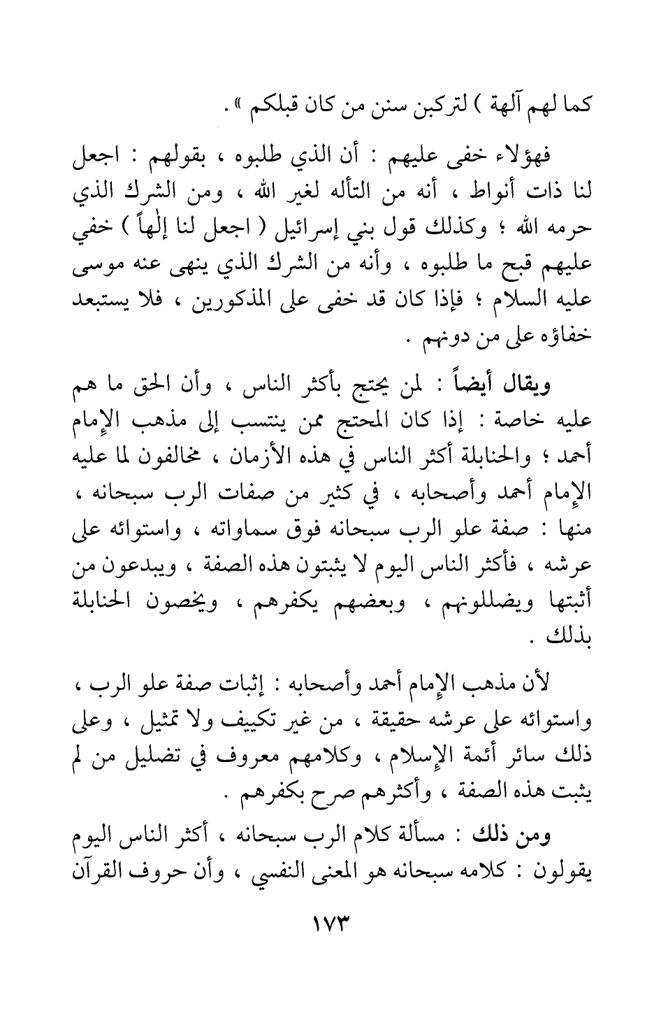 ويقال أيضا لمن يحتج بأكثر الناس، وأن الحق ما هم عليه خاصة: إذا كان المحتج ممن ينتسب إلى مذهب الإمام أحمد ; والحنابلة أكثر الناس في هذه الأزمان، مخالفون لما عليه الإمام أحمد وأصحابه، في كثير من صفات الرب سبحانه، منها: صفة علو الرب سبحانه فوق سماواته، واستوائه على عرشه، فأكثر الناس اليوم لا يثبتون هذه الصفة، ويبدعون من أثبتها ويضللونهم، وبعضهم يكفرهم، ويخصون الحنابلة بذلك،
