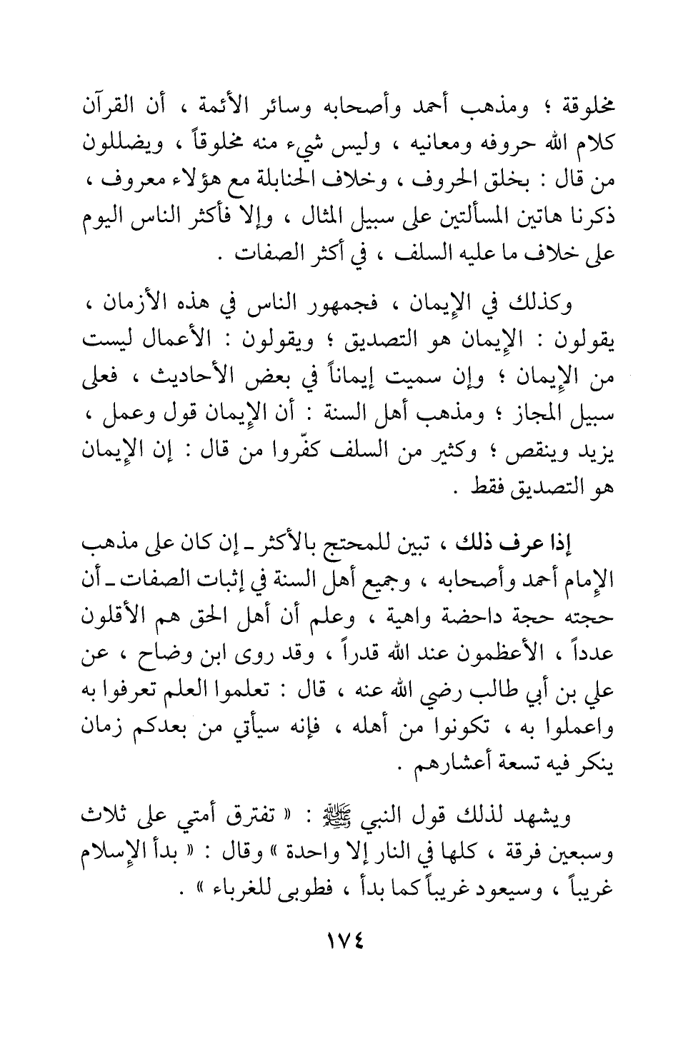 إذا عرف ذلك، تبين للمحتج بأكثر - إن كان على مذهب الإمام أحمد وأصحابه، وجميع أهل السنة في إثبات الصفات - أن حجته حجة داحضة واهية، وعلم أن أهل الحق هم الأقلون عددا، الأعظمون عند الله قدرا، وقد روى ابن وضاح، عن علي ابن أبي طالب رضي الله عنه قال: "تعلموا العلم تعرفوا به، واعملوا به تكونوا من أهله؛ فإنه سيأتي من بعدكم زمان ينكر فيه تسعة أعشارهم".