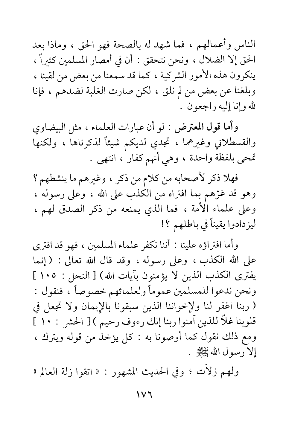 وأما قول المعترض: لو أن عبارات العلماء، مثل البيضاوي والقسطلاني وغيرهما، تجدي لديكم شيئا لذكرناها، ولكنها تمحى بلفظة واحدة، وهي أنهم كفار، انتهى.