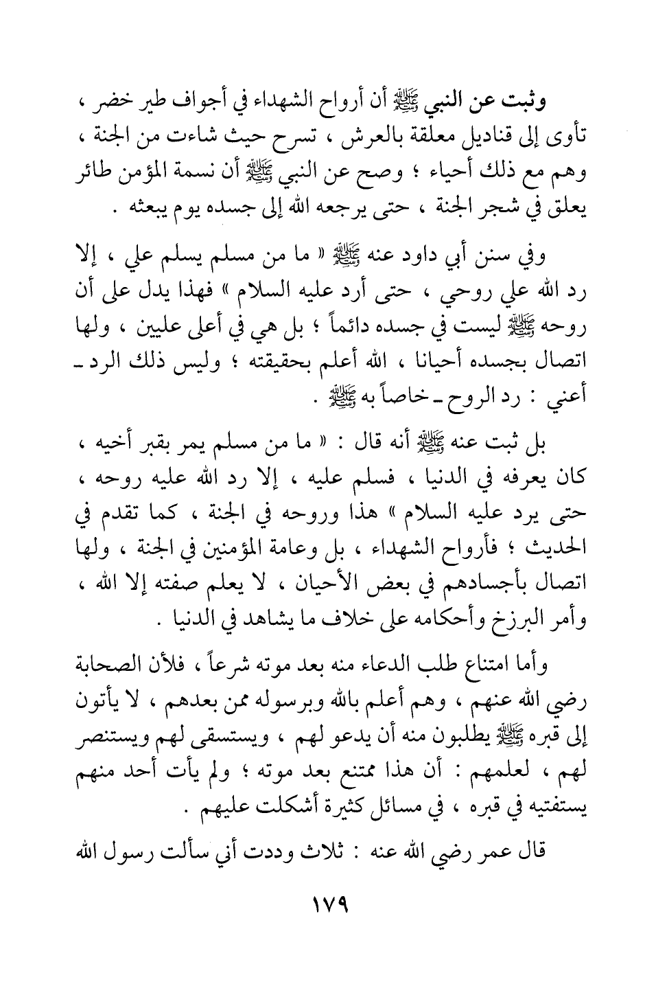 وثبت عن النبي صلى الله عليه وسلم أن أرواح الشهداء في أجواف طير خضر، تأوي إلى قناديل معلقة بالعرش، تسرح حيث شاءت من الجنة، وهم مع ذلك أحياء ; وصح عن النبي صلى الله عليه وسلم أن نسمة المؤمن طائر يعلق في شجر الجنة، حتى يرجعه الله إلى جسده يوم يبعثه. وفي سنن أبي داود عنه صلى الله عليه وسلم: " ما من مسلم يسلم علي، إلا رد الله علي روحي، حتى أرد عليه السلام "1، فهذا يدل على أن روحه صلى الله عليه وسلم ليست في جسده دائما ; بل هي في أعلى عليين، ولها اتصال بجسده أحيانا، الله أعلم بحقيقته.