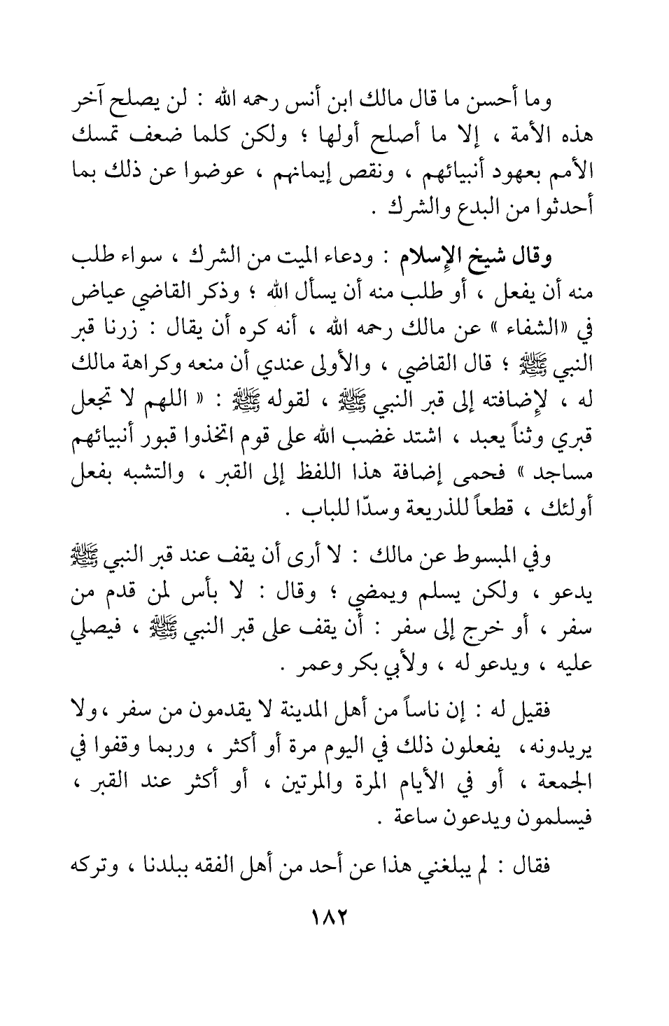 وقال شيخ الإسلام: ودعاء الميت من الشرك، سواء طلب منه أن يفعل، أو طلب منه أن يسأل الله ; وذكر القاضي عياض في "الشفاء" عن مالك رحمه الله، أنه كره أن يقال: زرنا قبر النبي صلى الله عليه وسلم: قال القاضي، والأولى عندي أن منعه وكراهة مالك له، لإضافته إلى قبر النبي صلى الله عليه وسلم لقوله صلى الله عليه وسلم: " اللهم لا تجعل قبري وثنا يعبد. اشتد غضب الله على قوم اتخذوا قبور أنبيائهم مساجد " 1، فحمى إضافة هذا اللفظ إلى القبر، والتشبه بفعل أولئك، قطعا للذريعة وسدا للباب.